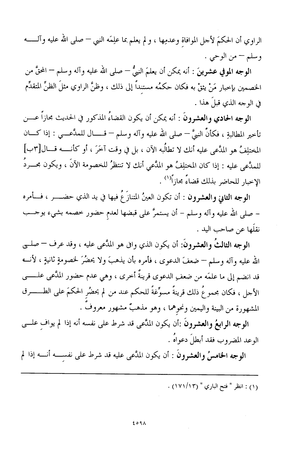 الوجه الموفي عشرين: أنه يمكن أن يعلم النبي - صَلَّى اللهُ عَلَيْهِ وَآلِهِ وَسَلَّمَ - المحق من الخصمين بإخبار من يثق به فكان حكمه مستندًا إلى ذلك، وظن الراوي مثل الظن المتقدم في الوجه الذي قبل هذا.