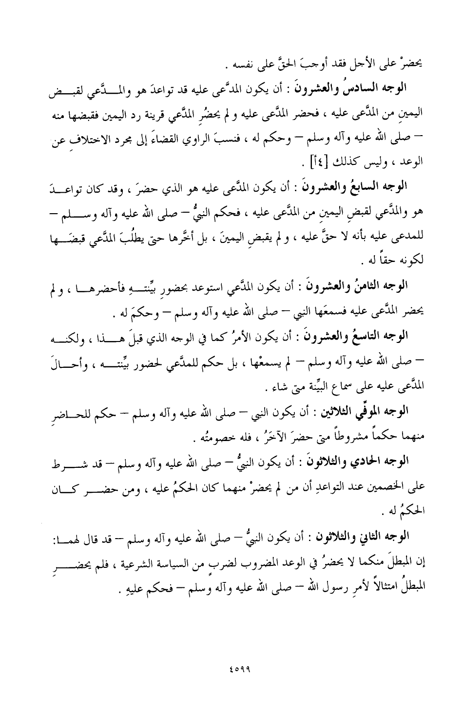 الوجه التاسع والعشرون: أن يكون الأمر كما في الوجه الذي قبل هذا، ولكنه - صَلَّى اللهُ عَلَيْهِ وَآلِهِ وَسَلَّمَ - لم يسمعها، بل حكم للمدعي لحضور بينته، وأحال المدعى عليه على سماع البينة متى شاء.