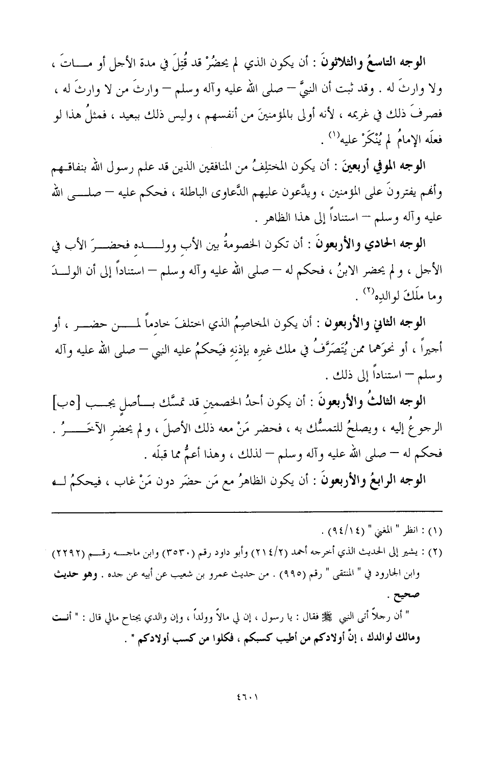 الوجه الثالث والأربعون: أن يكون أحد الخصمين قد تمسك بأصل يجب [5ب] الرجوع إليه، ويصلح للتمسك به، فحضر من معه ذلك الأصل، ولم يحضر الآخر. فحكم له النبي - صَلَّى اللهُ عَلَيْهِ وَآلِهِ وَسَلَّمَ - لذلك، وهذا أعم مما قبله.