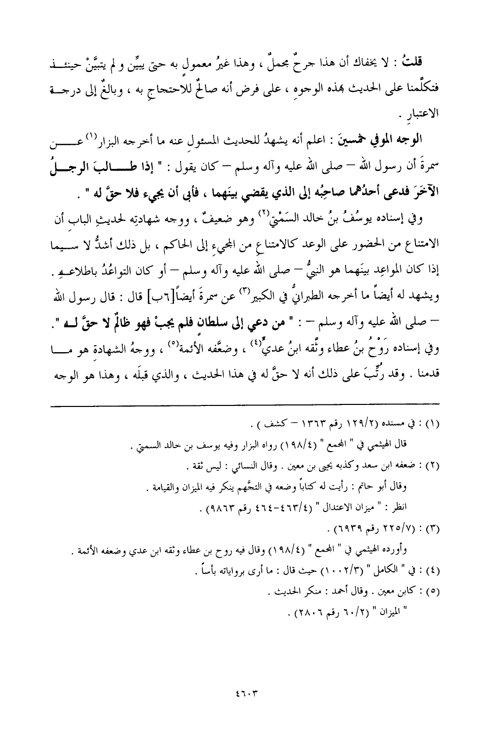 الوجه الموفي خمسين: اعلم أنه يشهد للحديث المسئول عنه ما أخرجه البزار (¬1) عن سمرة أن رسول الله - صَلَّى اللهُ عَلَيْهِ وَآلِهِ وَسَلَّمَ - كان يقول: " إذا طالب الرجل الآخر فدعى أحدهما صاحبه إلى الذي يقضي بينهما، فأبى أن يجيء فلا حق له ".