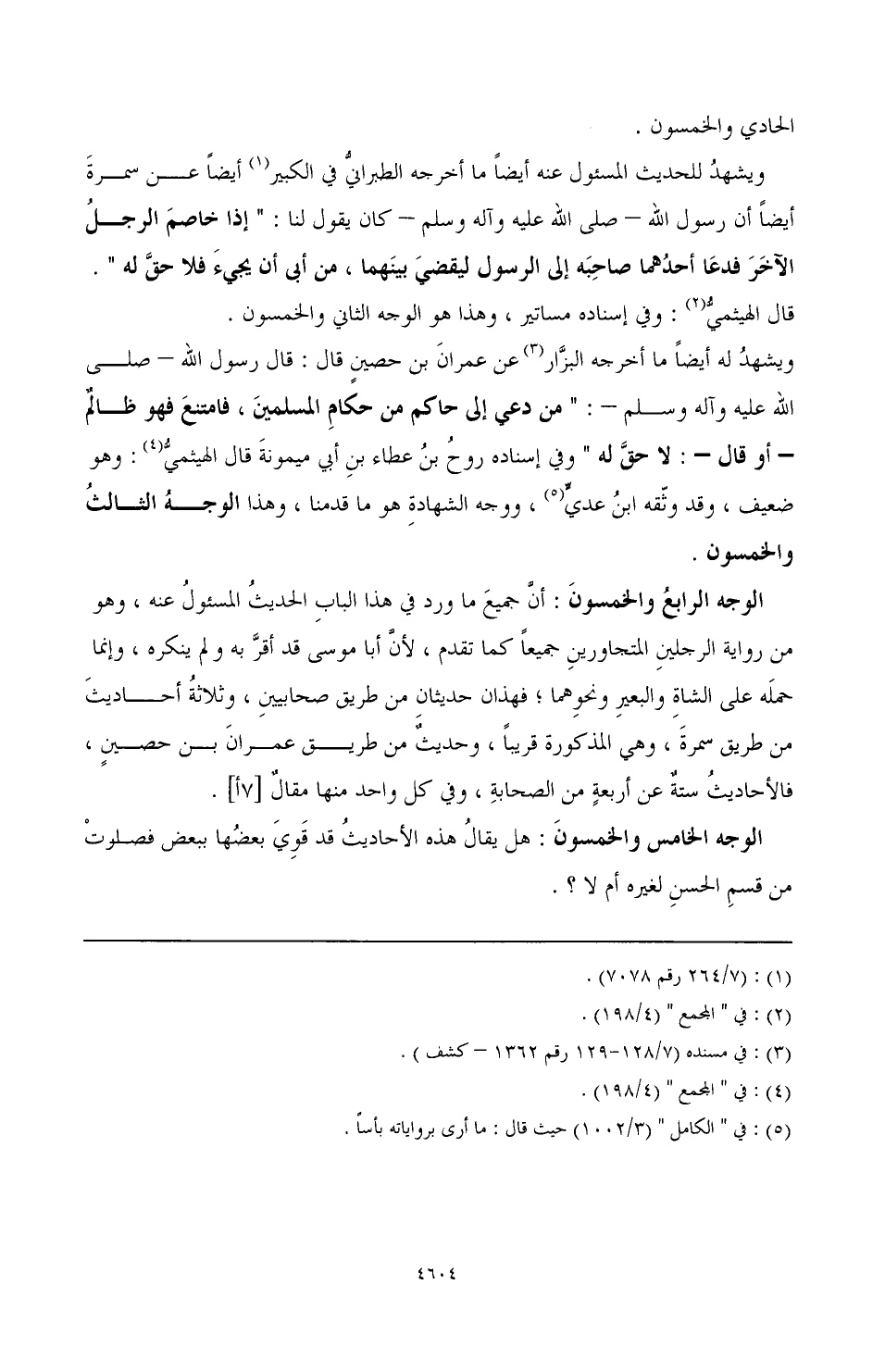 ويشهد للحديث المسئول عنه أيضًا ما أخرجه الطبراني في الكبير (¬1) أيضًا عن سمرة أيضًا أن رسول الله - صَلَّى اللهُ عَلَيْهِ وَآلِهِ وَسَلَّمَ - كان يقول لنا: " إذا خاصم الرجل الآخر فدعا أحدهما صاحبه إلى الرسول ليقضي بينهما، من أبى أن يجيء فلا حق له ". قال الهيثمي (¬2) وفي إسناده مساتير، وهذا هو الوجه الثاني والخمسون.