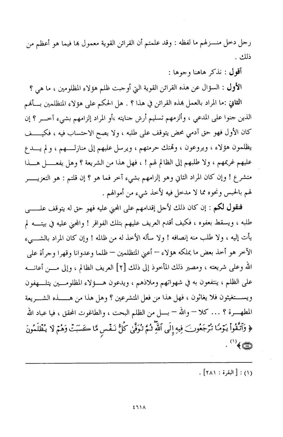 فنقول لكم: إن كان ذلك لأجل إقدامهم على المجني عليه فهو حق له يتوقف على طلبه، ويسقط بعفوه، فكيف أقدم العريف عليهم بتلك القوافر! والمجني عليه في بيته لم يأت إليه، ولا طلب منه إنصافه! ولا سأله الأخذ له من ظالمه! وإن كان المراد بالشيء الآخر هو أخذ بعض ما يملكه هؤلاء - أعني المتظلمين - ظلمًا وعدوانًا وقهرًا وجرأة على الله وعلى شريعته، ومصير ذلك المأخوذ إلى ذلك [2] العريف الظالم، وإلى من أعانه على الظلم، ينتفعون به في شهواتهم وملاذهم، ويدعون هؤلاء المظلومين يتلهفون ويستغيثون فلا يغاثون، فهل هذا من فعل المتشرعين؟ وهل هذا من هذه الشريعة المطهرة؟ ... كلا - والله - بل من الظلم البحت، والطاغوت المحقق، فيا عباد الله {واتقوا يوما ترجعون فيه إلى الله ثم توفى كل نفس ما كسبت وهم لا يظلمون} (¬1).