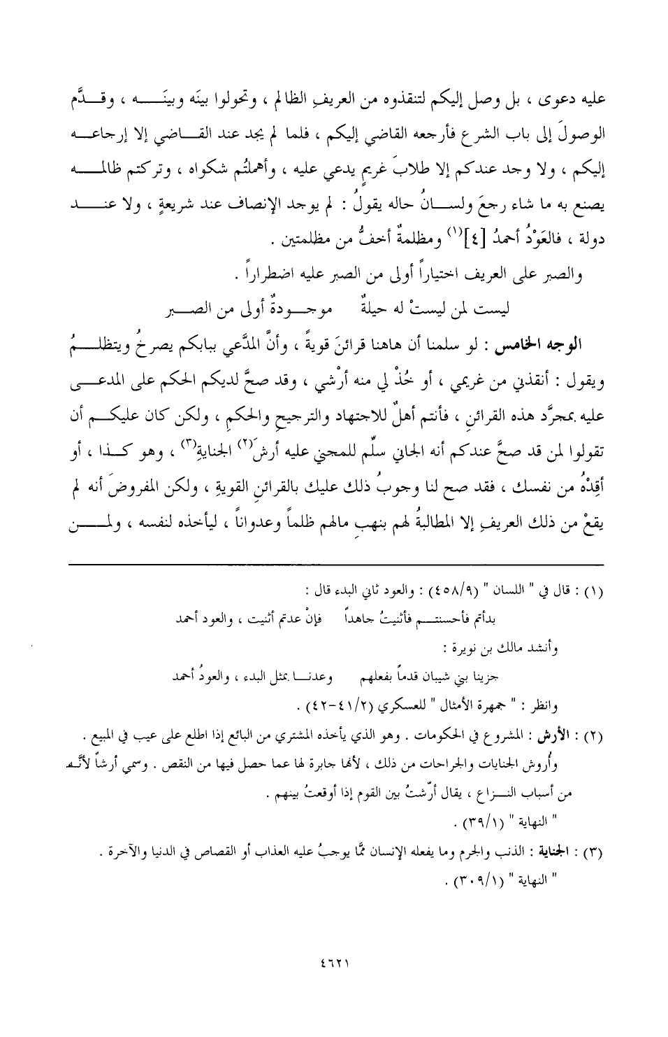 الوجه الخامس: لو سلمنا أن هاهنا قرائن قوية، وأن المدعي ببابكم يصرخ ويتظلم ويقول: أنقذني من غريمي، أو خذ لي منه أرشي، وقد صح لديكم الحكم على المدعى عليه بمجرد هذه القرائن، فأنتم أهل للاجتهاد والترجيح والحكم، ولكن كان عليكم أن تقولوا لمن قد صح عندكم أنه الجاني سلم للمجني عليه أرش (¬2) الجناية (¬3)، وهو كذا، أو أقده من نفسك، فقد صح لنا وجوب ذلك عليك بالقرائن القوية، ولكن المفروض أنه لم يقع من ذلك العريف إلا المطالبة لهم بنهب مالهم ظلمًا وعدوانًا، ليأخذه لنفسه، ولمن