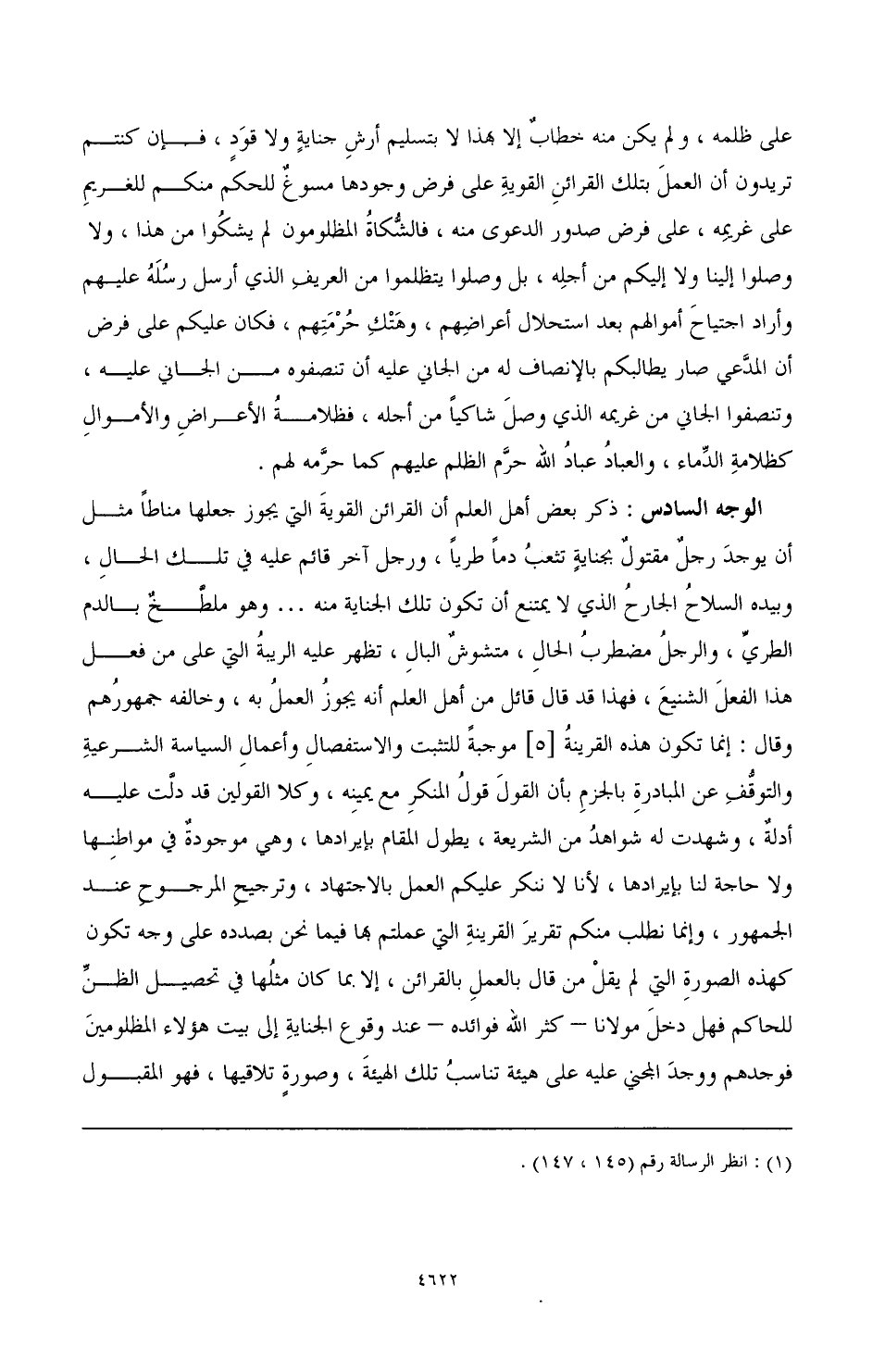 على ظلمه، ولم يكن منه خطاب إلا بهذا لا بتسليم أرش جناية ولا قود، فإن كنتم تريدون أن العمل بتلك القرائن القوية على فرض وجودها مسوغ للحكم منكم للغريم على غريمه، على فرض صدور الدعوى منه، فالشكاة المظلومون لم يشكوا من هذا، ولا وصلوا إلينا ولا إليكم من أجله، بل وصلوا يتظلموا من العريف الذي أرسل رسله عليهم وأراد اجتياح أموالهم بعد استحلال أعراضهم، وهتك حرمتهم، فكان عليكم على فرض أن المدعي صار يطالبكم بالإنصاف له من الجاني عليه أن تنصفوه من الجاني عليه، وتنصفوا الجاني من غريمه الذي وصل شاكيًا من أجله، فظلامة الأعراض والأموال كظلامة الدماء، والعباد عباد الله حرم الظلم عليهم كما حرمه لهم.