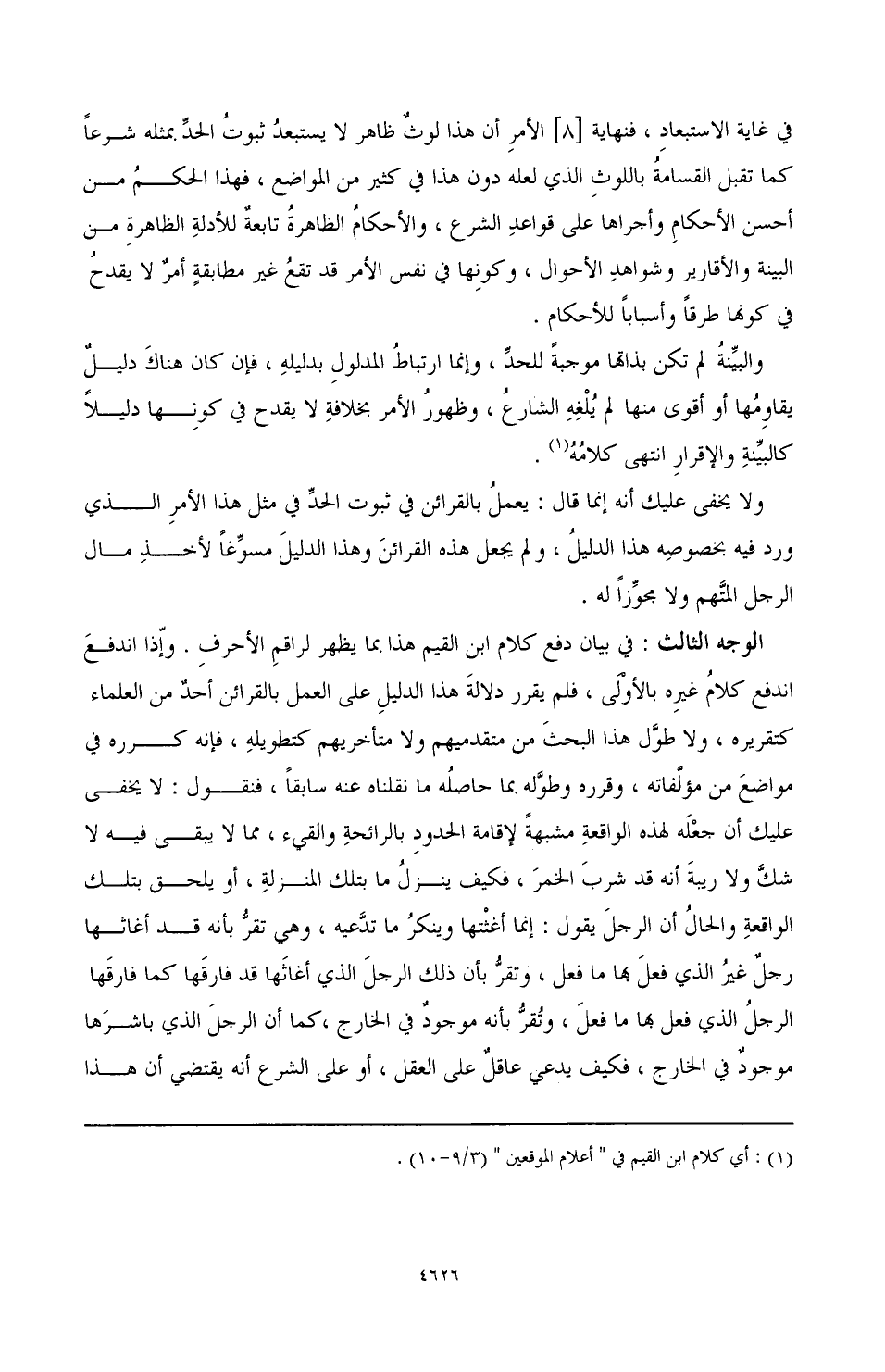 الوجه الثالث: في بيان دفع كلام ابن القيم هذا بما يظهر خلاف لراقم الأحرف. وإذا اندفع اندفع كلام غيره بالأولى، فلم يقرر دلالة هذا الدليل على العمل بالقرائن أحد من العلماء كتقريره، ولا طول هذا البحث من متقدميهم ولا متأخريهم كتطويله، فإنه كرره في مواضع من مؤلفاته، وقرره وطوله بما حاصله ما نقلناه عنه سابقًا، فنقول: لا يخفى عليك أن جعله لهذه الواقعة مشبهة لإقامة الحدود بالرائحة والقيء، مما لا يبقى فيه لا شك ولا ريبة أنه قد شرب الخمر، فكيف ينزل ما بتلك المنزلة، أو يلحق بتلك الواقعة والحال أن الرجل يقول: إنما أغثتها وينكر ما تدعيه، وهي تقر بأنه قد أغاثها رجل غير الذي فعل بها ما فعل، وتقر بأن ذلك الرجل الذي أغاثها قد فارقها كما فارقها الرجل الذي فعل بها ما فعل، وتقر بأنه موجود في الخارج، كما أن الرجل الذي باشرها موجود في الخارج، فكيف يدعي عاقل على العقل، أو على الشرع أنه يقتضي أن هذا