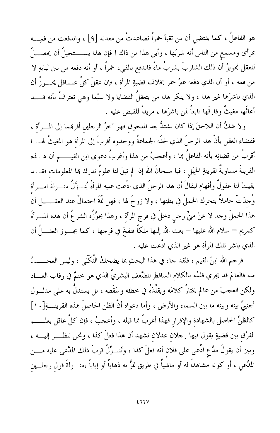 ولا شك أن اللاحق إذا كان يشتد بعد الملحوق فهو آخر الرجلين أقربهما إلى المرأة، فقضاء العقل بأن هذا الرجل الذي لحقه الجماعة ووجده أقرب إلى المرأة هو المغيث لها أقرب من قضائه بأنه الفاعل بها، وأعجب من هذا وأغرب دعوى ابن القيم أن هذه القرينة مساوية لقرينة الحبل، فيا سبحان الله إذا لم تبق لنا علوم ندرك بها المعلومات فقد بقيت لنا عقول وأفهام ليقال أن هذا الرجل الذي ادعت عليه المرأة ينزل منزلة امرأة وجدت حاملاً يتحرك الحمل في بطنها، ولا زوج لها، فهل ثمة احتمال عند العقل أن هذا الحمل وجد لا عن مني رجل دخل في فرج المرأة، وهذا يجوزه الشرع أم هذه المرأة كمريم - سلام الله عليها - بعث الله إليها ملكًا فنفخ في فرجها، كما يجوز العقل أن الذي باشر تلك المرأة هو غير الذي ادعت عليه.
