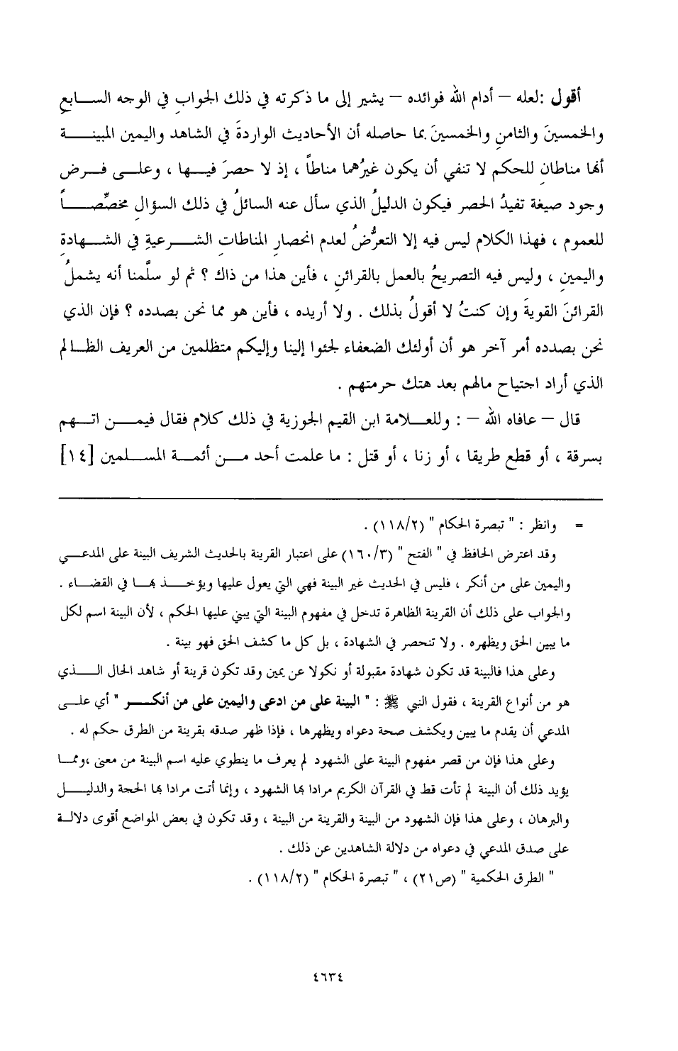 أقول: لعله - أدام الله فوائده - يشير إلى ما ذكرته في ذلك الجواب في الوجه السابع والخمسين والثامن والخمسين بما حاصله أن الأحاديث الواردة في الشاهد واليمين المبينة أنها مناطان للحكم لا تنفي أن يكون غيرهما مناطًا، إذ لا حصر فيها، وعلى فرض وجود صيغة تفيد الحصر فيكون الدليل الذي سأل عنه السائل في ذلك السؤال مخصصًا للعموم، فهذا الكلام ليس فيه إلا التعرض لعدم انحصار المناطات الشرعية في الشهادة واليمين، وليس فيه التصريح بالعمل بالقرائن، فأين هذا من ذاك؟ ثم لو سلمنا أنه يشمل القرائن القوية وإن كنت لا أقول بذلك. ولا أريده، فأين هو مما نحن بصدده؟ فإن الذي نحن بصدده أمر آخر هو أن أولئك الضعفاء لجئوا إلينا وإليكم متظلمين من العريف الظالم الذي أراد اجتياح مالهم بعد هتك حرمتهم.