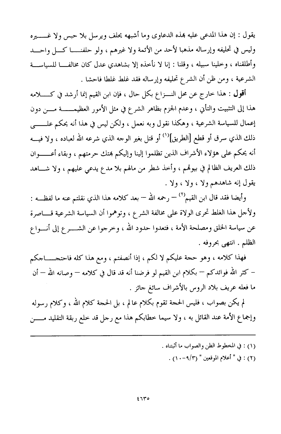 فهذا كلامه، وهو حجة عليكم لا لكم، إذا أنصفتم، ومع هذا كله فاحتجاجكم - كثر الله فوائدكم - بكلام ابن القيم لو فرضنا أنه قد قال في كلامه - وصانه الله - أن ما فعله عريف بلاد الروس بالأشراف سائغ جائز.