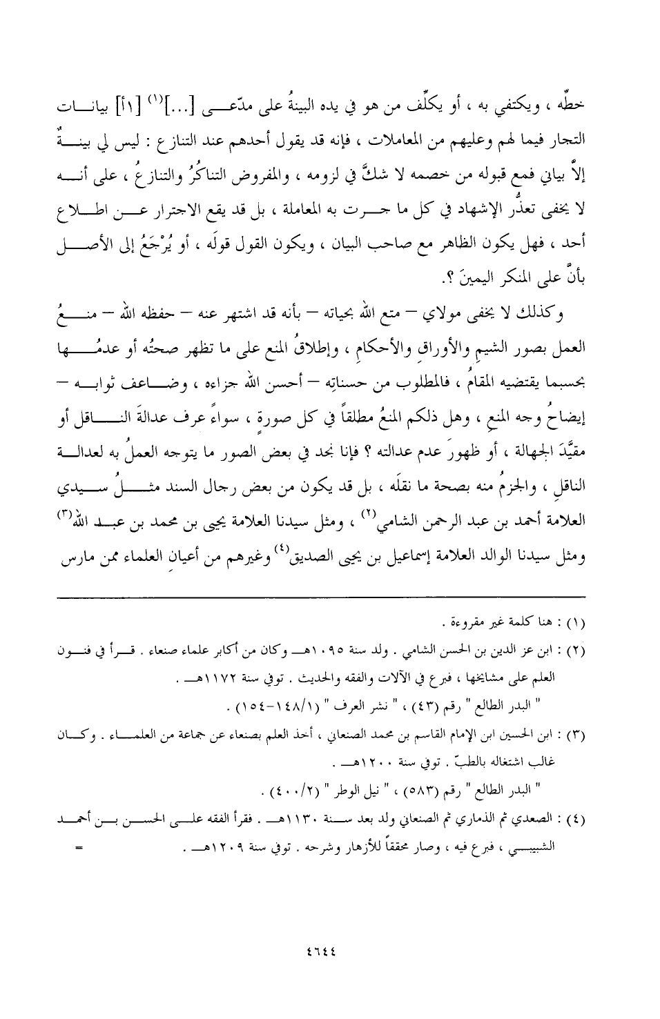 وكذلك لا يخفى على مولاي - متع الله بحياته - بأنه قد اشتهر عنه - حفظه الله - منع العمل بصور الشيم والأوراق والأحكام، وإطلاق المنع على ما تظهر صحته أو عدمها بحسبما يقتضيه المقام، فالمطلوب من حسناته - أحسن الله جزاءه، وضاعف ثوابه - إيضاح وجه المنع، وهل ذلكم المنع مطلقًا في كل صورة، سواء عرف عدالة الناقل أو مقيد الجهالة، أو ظهور عدم عدالته؟ فإنا نجد في بعض الصور ما يتوجه العمل به لعدالة الناقل، والجزم منه بصحة ما نقله، بل قد يكون من بعض رجال السند مثل سيدي العلامة أحمد بن عبد الرحمن الشامي (¬2)، ومثل سيدنا العلامة يحيى بن عبد الله (¬3) ومثل سيدنا الوالد العلامة إسماعيل بن يحيى الصديق (¬4) وغيرهم من أعيان العلماء ممن مارس