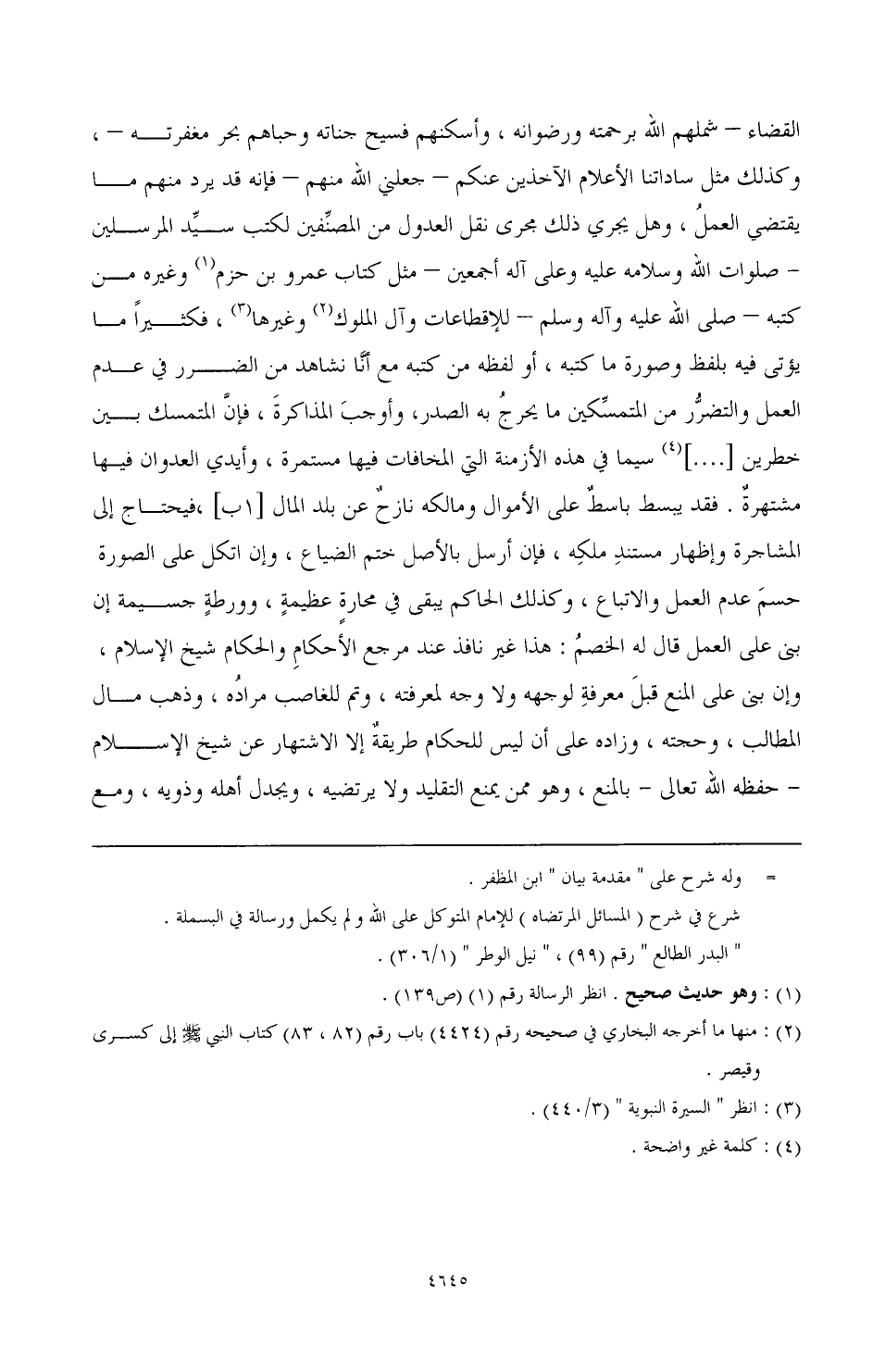 القضاء - شملهم الله برحمته ورضوانه، وأسكنهم فسيح جناته وحباهم بحر مغفرته - وكذلك مثل ساداتنا الأعلام الآخذين عنكم - جعلني الله منهم - فإنه قد يرد منهم ما يقتضي العمل، وهل يجري ذلك مجرى نقل العدول من المنصفين لكتب سيد المرسلين - صلوات الله وسلامه عليه وعلى آله أجمعين - مثل كتاب عمرو بن حزم (¬1) وغيره من كتبه - صَلَّى اللهُ عَلَيْهِ وَآلِهِ وَسَلَّمَ -- للإقطاعات وآل الملوك (¬2) وغيرها (¬3)، فكثيرًا ما يؤتى فيه بلفظ وصورة ما كتبه، أو لفظه من كتبه مع أنا نشاهد من الضرر في عدم العمل والتضرر من المتمسكين ما يحرج به الصدر، وأوجب المذاكرة، فإن المتمسك بين خطرين [ .... ] (¬4) سيما في هذه الأزمنة التي المخافات فيها مستمرة، وأيدي العدوان فيها مشتهرة. فقد يبسط باسط على الأموال ومالكه نازح عن بلد المال [1ب]، فيحتاج إلى المشاجرة وإظهار مستند ملكه، فإن أرسل بالأصل ختم الضياع، وإن اتكل على الصورة حسم عدم العمل والاتباع، وكذلك الحاكم يبقى في محارة عظيمة، وورطة جسيمة إن بنى على العمل قال له الخصم: هذا غير نافذ عند مرجع الأحكام والحكام شيخ الإسلام، وإن بنى على المنع قبل معرفة لوجهه ولا وجه لمعرفته، وتم للغاصب مراده، وذهب مال المطالب، وحجته، وزاده على أن ليس للحكام طريقة إلا الاشتهار عن شيخ الإسلام - حفظه الله تعالى - بالمنع، وهو ممن يمنع التقليد ولا يرتضيه، ويجدل أهله وذويه، ومع