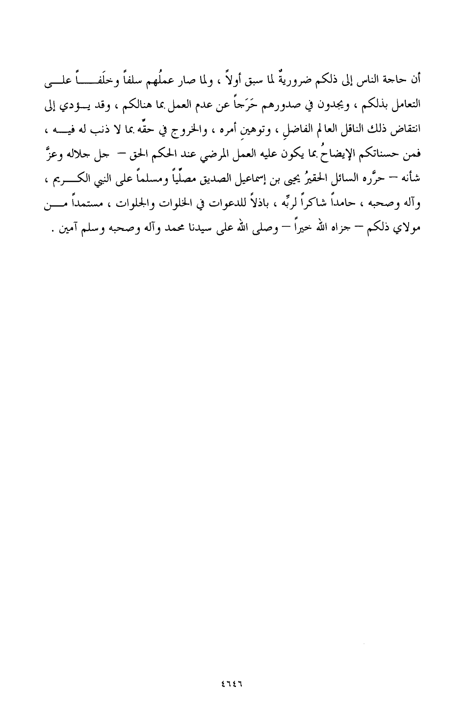 أن حاجة الناس إلى ذلكم ضرورية لما سبق أولاً، ولما صار عملهم سلفًا وخلفًا على التعامل بذلكم، ويجدون في صدورهم حرجًا عن عدم العمل بما هنالكم، وقد يؤدي إلى انتقاض ذلك الناقل العالم الفاضل، وتوهين أمره، والخروج في حقه بما لا ذنب له فيه، فمن حسناتكم الإيضاح بما يكون عليه العمل المرضي عند الحكم الحق - جل جلاله وعز شأنه - حرره السائل الحقير يحيى بن إسماعيل الصديق مصليًا ومسلمًا على النبي الكريم، وآله وصحبه، حامدًا شاكرًا لربه، باذلاً للدعوات في الخلوات والجلوات، مستمدًا من مولاي ذلكم - جزاه الله خيرًا - وصلى الله على سيدنا محمد وآله وصحبه وسلم آمين.