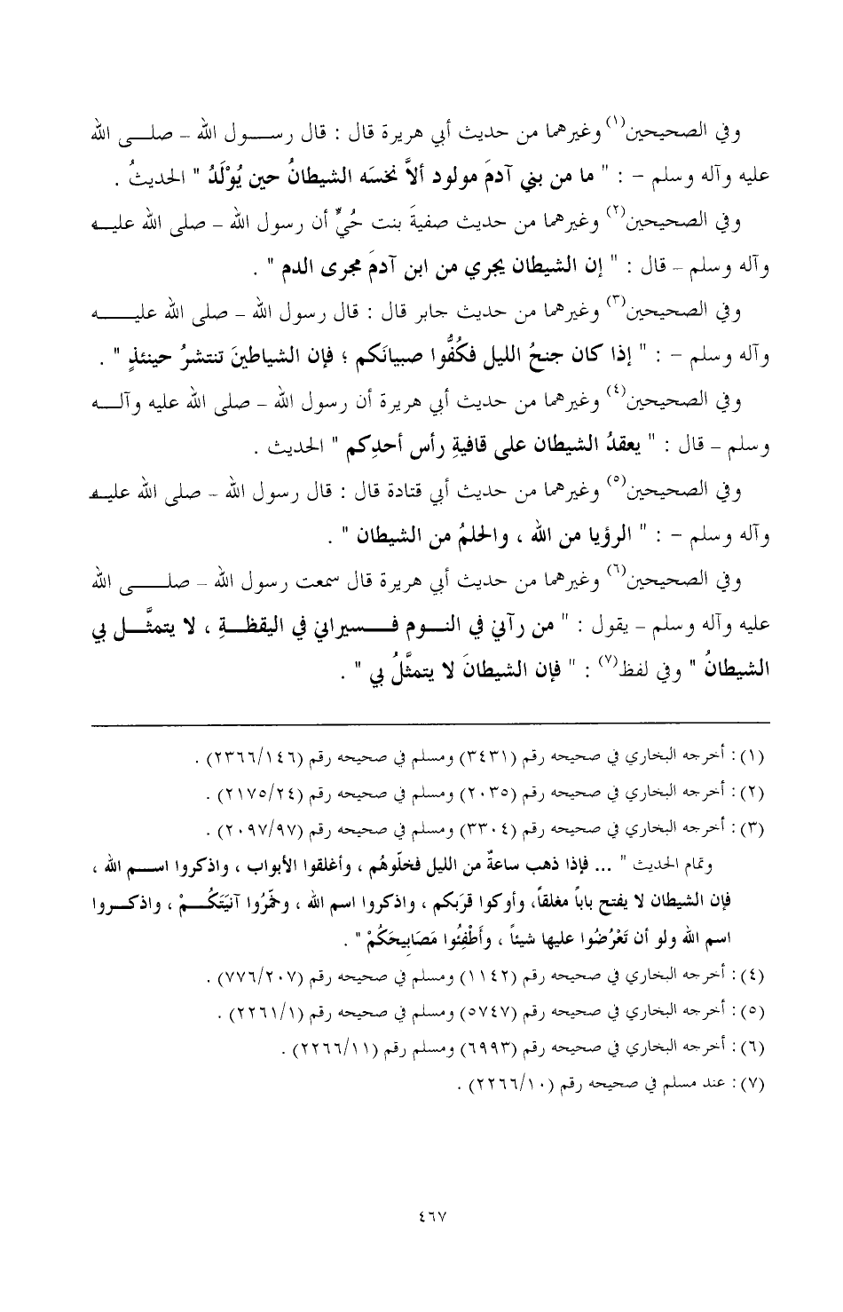 وفي الصحيحين (¬3) وغيرهما من حديث جابر قال: قال رسول الله -صَلَّى اللهُ عَلَيْهِ وَآلِهِ وَسَلَّمَ-: "إذا كان جنح الليل فكفوا صبيانكم، فإن الشياطين تنتشر حينئذ". وفي الصحيحين (¬4) وغيرهما من حديث أبي هريرة أن رسول الله -صَلَّى اللهُ عَلَيْهِ وَآلِهِ وَسَلَّمَ- قال: "يعقد الشيطان على قافية رأس أحدكم" الحديث.
