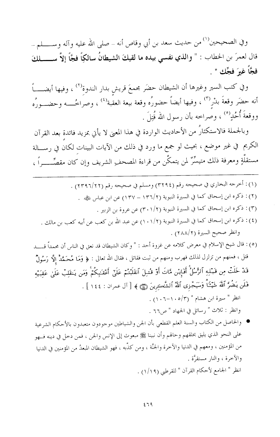 (¬5) قال شيخ الإسلام في معرض كلامه عن غزوة أحد: "وكان الشيطان قد نعق في الناس أن محمدا قد قتل، فمنهم من تزلزل لذلك فهرب ومنهم من ثبت فقاتل، فقال الله تعالى:} وَمَا مُحَمَّدٌ إِلَّا رَسُولٌ قَدْ خَلَتْ مِنْ قَبْلِهِ الرُّسُلُ أَفَإِنْ مَاتَ أَوْ قُتِلَ انْقَلَبْتُمْ عَلَى أَعْقَابِكُمْ وَمَنْ يَنْقَلِبْ عَلَى عَقِبَيْهِ فَلَنْ يَضُرَّ اللَّهَ شَيْئًا وَسَيَجْزِي اللَّهُ الشَّاكِرِينَ {[آل عمران: 144].