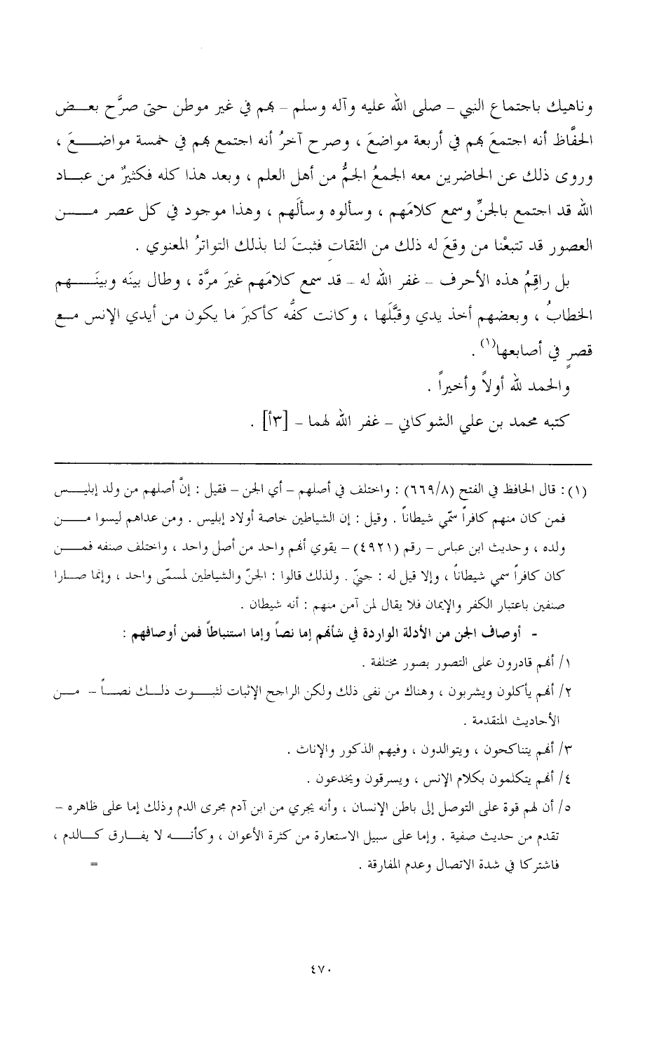 وناهيك باجتماع النبي -صَلَّى اللهُ عَلَيْهِ وَآلِهِ وَسَلَّمَ- بهم في غير موطن حتى صرح بعض الحفاظ أنه اجتمع بهم في أربعة مواضع، وصرح آخر أنه اجتمع هم في خمسة مواضع، وروى ذلك عن الحاضرين معه الجمع الجم من أهل العلم، وبعد هذا كله فكثير من عباد الله قد اجتمع بالجن وجمع كلامهم، وسألوه وسألهم، وهذا موجود في كل عصر من العصور قد تتبعنا من وقع له ذلك من الثقات فثبت لنا بذلك التواتر المعنوي.