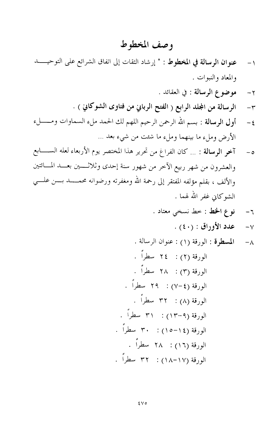 5 - آخر الرسالة:. . . كان الفراغ من تحرير هذا المختصر يوم الأربعاء لعله السابع والعشرون من شهر ربيع الآخر من شهور سنة إحدى وثلاثين بعد المائتين والألف، بقلم مؤلفه المفتقر إلى رحمة الله ومغفرته ورضوانه محمد بن علي الشوكاني غفر الله لهما.