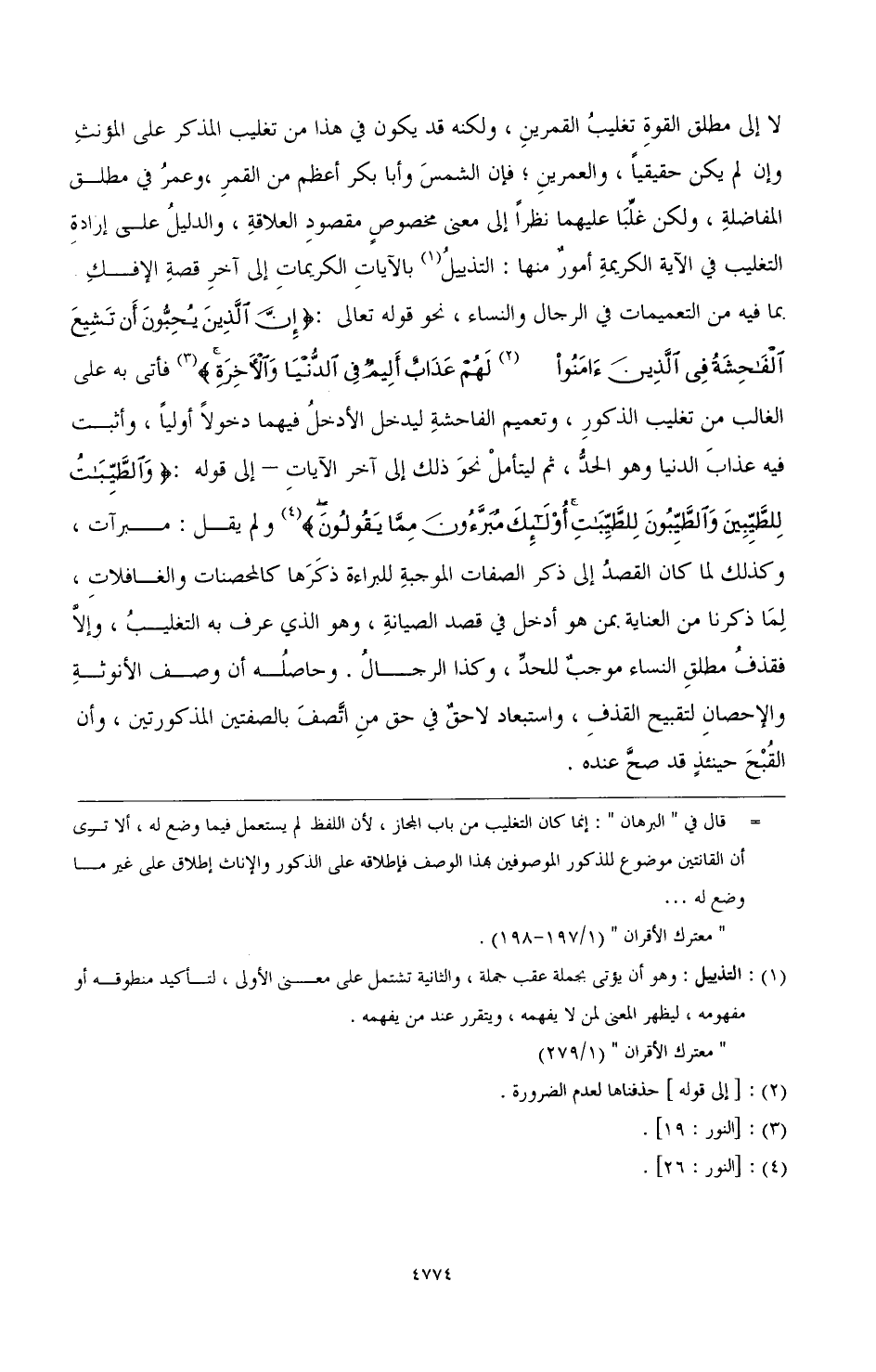 لا إلى مطلق القوة تغليب القمرين، ولكنه قد يكون في هذا من تغليب المذكر على المؤنث وإن لم يكن حقيقيا، والعمرين؛ فإن الشمس وأبا بكر أعظم من القمر، وعمر في مطلق المفاضلة، ولكن غلب عليهما نظرا إلى معنى مخصوص مقصود العلاقة، والدليل على إرادة التغليب في الآية الكريمة أمور منها: التذييل (¬1) بالآيات الكريمات إلى آخر قصة الإفك، بما فيه من التعميمات في الرجال والنساء، نحو قوله تعالى: {إِنَّ الَّذِينَ يُحِبُّونَ أَنْ تَشِيعَ الْفَاحِشَةُ فِي الَّذِينَ آمَنُوا} (¬2) {لَهُمْ عَذَابٌ أَلِيمٌ فِي الدُّنْيَا وَالْآخِرَةِ} (¬3) فأتى به على الغالب من تغليب الذكور، وتعميم الفاحشة ليدخل الأدخل فيهما دخولا أوليا، وأثبت فيه عذاب الدنيا وهو الحد، ثم ليتأمل نحو ذلك إلى آخر الآيات - إلى قوله: {وَالطَّيِّبَاتُ لِلطَّيِّبِينَ وَالطَّيِّبُونَ لِلطَّيِّبَاتِ أُولَئِكَ مُبَرَّءُونَ مِمَّا يَقُولُونَ} (¬4) ولم يقل: مبرآت، وكذلك لما كان القصد إلى ذكر الصفات الموجبة للبراءة ذكرها كالمحصنات والغافلات، لما ذكرنا من العناية بمن هو أدخل في قصد الصيانة، وهو الذي عرف به التغليب، وإلا فقذف مطلق النساء موجب للحد، وكذا الرجال، وحاصله أن وصف الأنوثة والإحصان لتقبيح القذف، واستبعاد لاحق في حق من اتصف بالصفتين المذكورتين، وأن القبح حينئذ قد صح عنده.