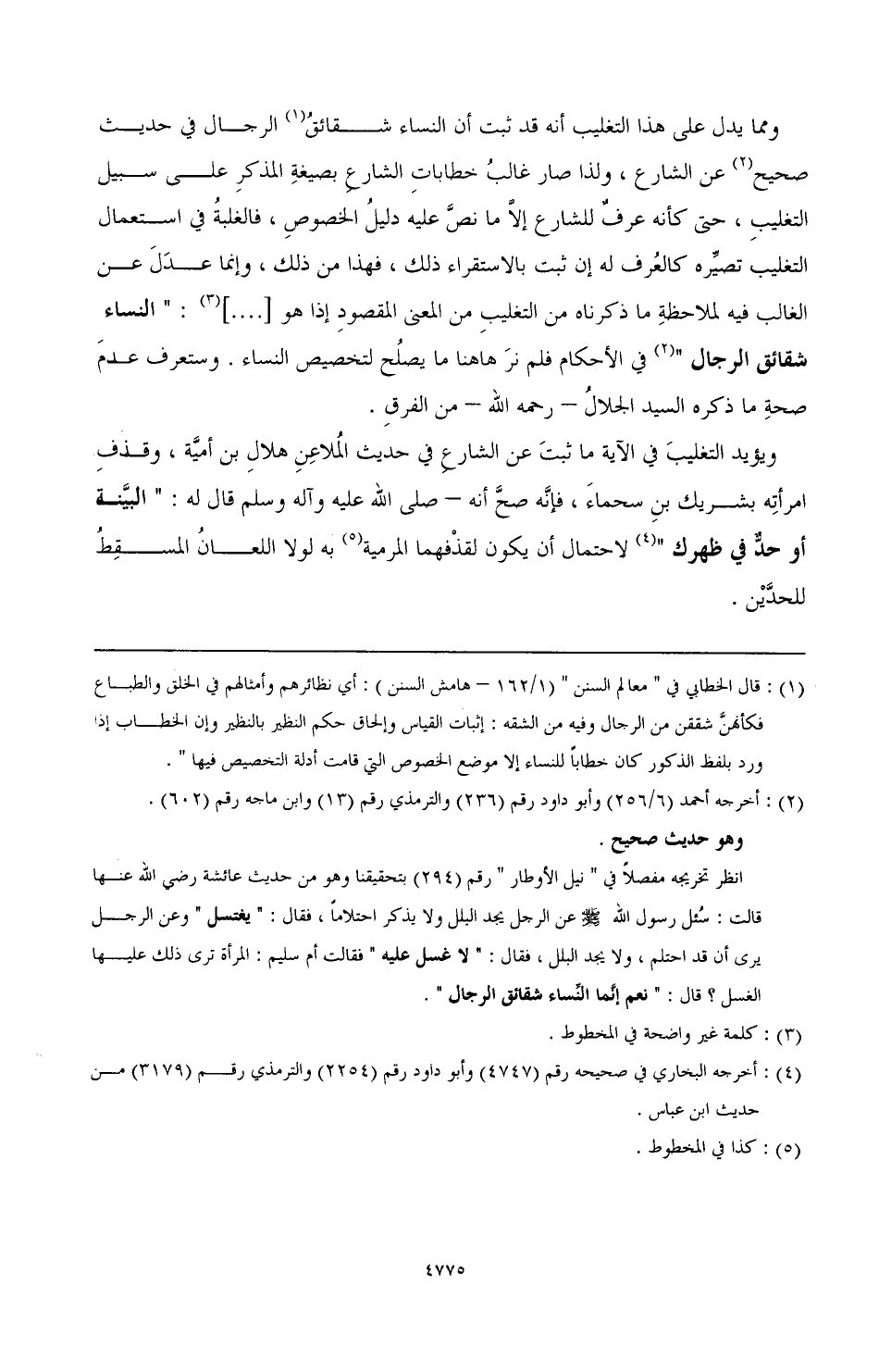 ومما يدل على هذا التغليب أنه قد ثبت أن النساء شقائق (¬1) الرجال في حديث صحيح (¬2) عن الشارع، ولذا صار غالب خطابات الشارع بصيغة المذكر على سبيل التغليب، حتى كأنه عرف للشارع إلا ما نص عليه دليل الخصوص، فالغلبة في استعمال التغليب تصيره كالعرف له إن ثبت بالاستقراء ذلك، فهذا من ذلك، وإنما عدل عن الغالب فيه لملاحظة ما ذكرناه من التغليب من المعنى المقصود إذا هو [ .... ] (¬3): " النساء شقائق الرجال " (¬4) في الأحكام فلم نر هاهنا ما يصلح لتخصيص النساء. وستعرف عدم صحة ما ذكره السيد الجلال - رحمه الله - من الفرق.