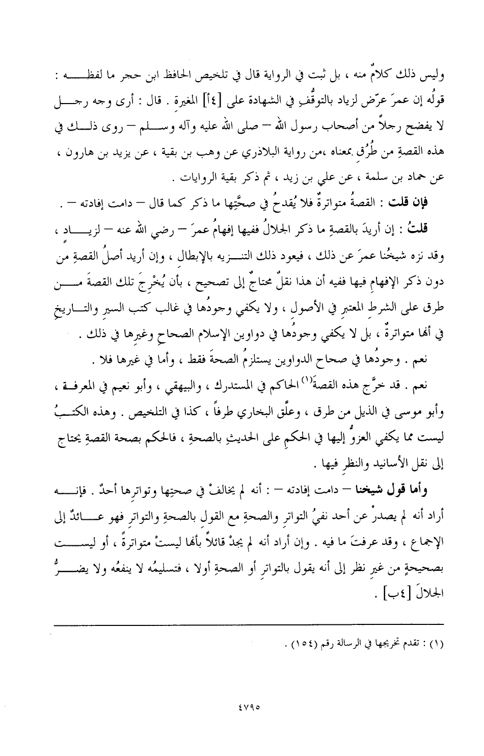 قلت: إن أريد بالقصة ما ذكر الجلال ففيها إفهام عمر رضي الله عنه لزياد، وقد نزه شيخنا عمر عن ذلك، فيعود ذلك التنزيه بالإبطال، وإن أريد أصل القصة من دون ذكر الإفهام فيها ففيه أن هذا نقل محتاج إلى تصحيح، بأن يخرج تلك القصة من طرق على الشرط المعتبر في الأصول، ولا يكفي وجودها في غالب كتب السير والتاريخ في أنها متواترة بل لا يكفي وجودها في دواوين الإسلام الصحاح وغيرها في ذلك.