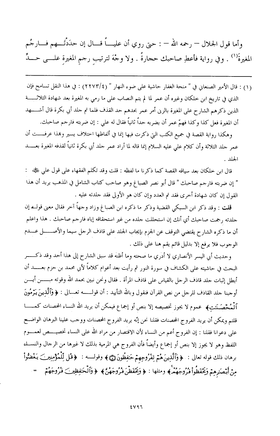 (¬1) قال الأمير الصنعاني في " منحة الغفار حاشية على ضوء النهار " (4/ 2273): في هذا النقل تسامح فإن الذي في تاريخ ابن خلكان وغيره أن عمر لما لم يتم النصاب على ما رمي به المغيرة بعد شهادة الثلاثة الذين ذكرهم الشارح على المغيرة بالزنى أمر عمر بحدهم حد القذف فلما تم جلد أبي بكرة قال: أشهد أن المغيرة فعل كذا وكذا فهم عمر أن يضربه حدا ثانيا فقال له علي: إن ضربته فارجم صاحبك.