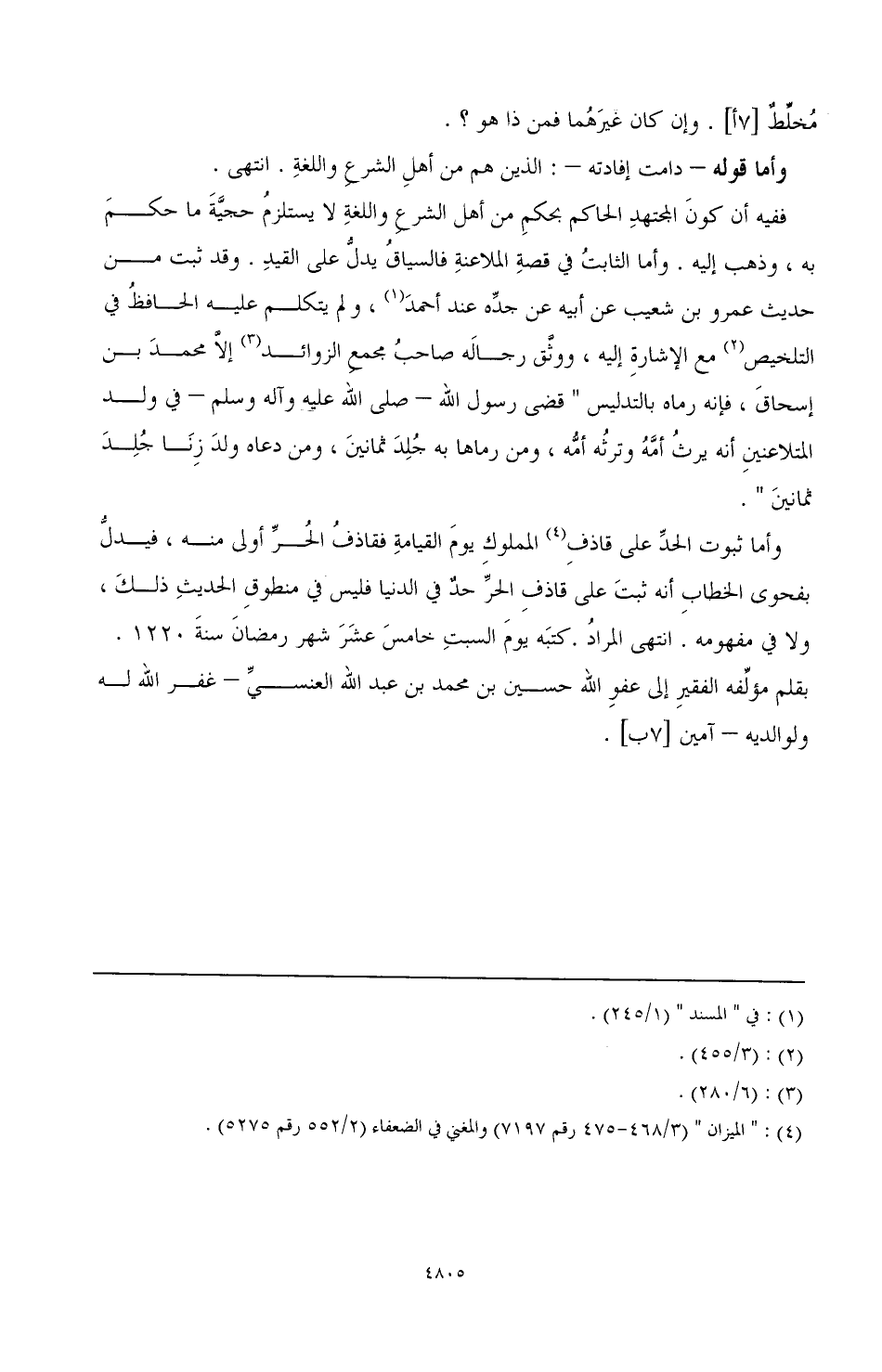 وأما ثبوت الحد على قاذف (¬4) المملوك يوم القيامة فقاذف الحر أولى منه، فيدل بفحوى الخطاب أنه ثبت على قاذف الحر حد في الدنيا فليس في منطوق الحديث ذلك، ولا في مفهومه. انتهى المراد. كتبه يوم السبت خامس عشر شهر رمضان سنة 1220. بقلم مؤلفه الفقير إلى عفو الله حسين بن محمد بن عبد الله العنسي - غفر الله له ولوالديه - آمين [7ب].