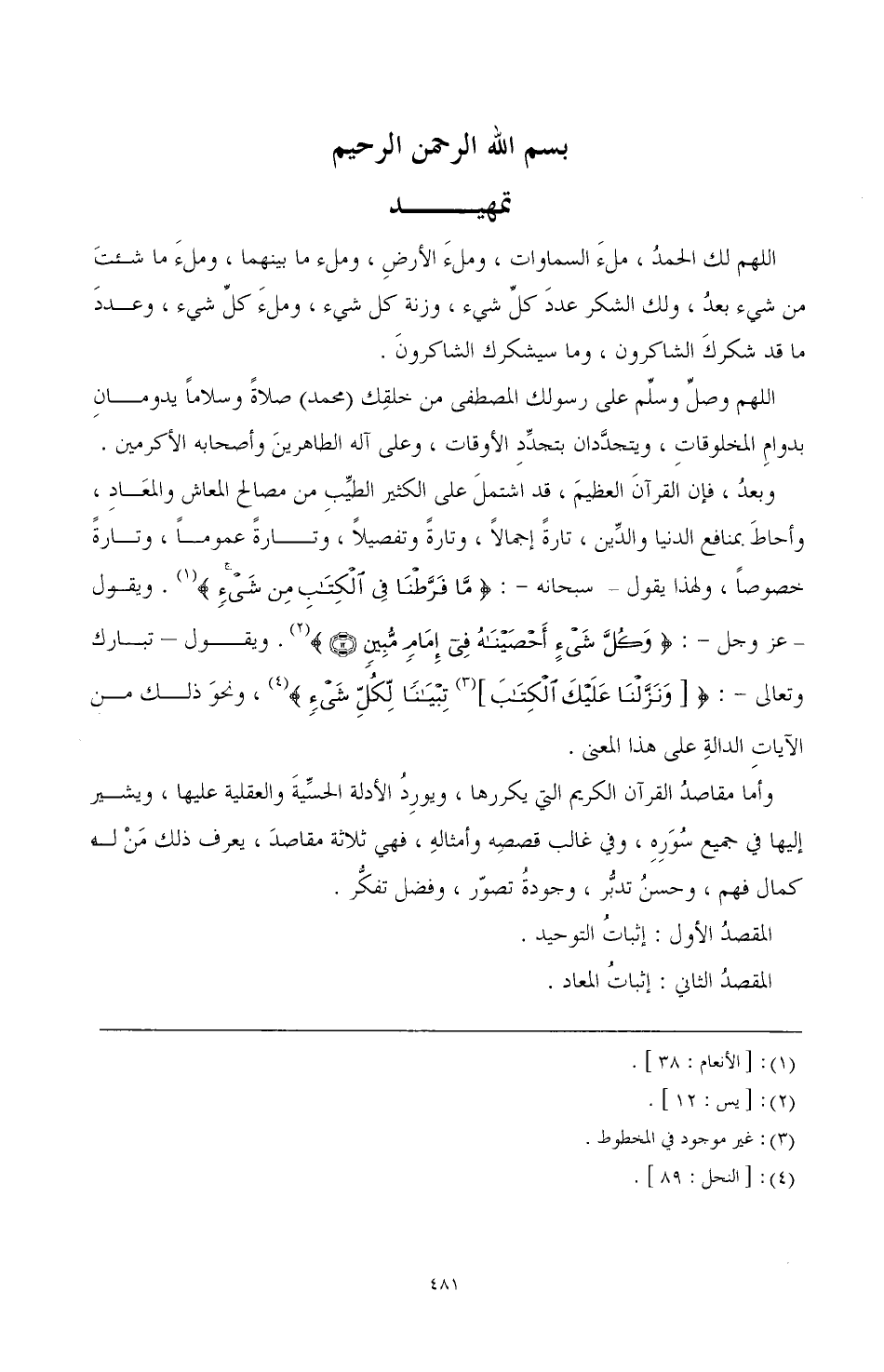 وبعد، فإن القرآن العظيم قد اشتمل على الكثير الطيب من مصالح المعاش والمعاد، وأحاط بمنافع الدنيا والدين، تارة إجمالا، وتارة تفصيلا، وتارة عموما، وتارة خصوصا، ولهذا يقول -سبحانه-:} ما فرطنا في الكتاب من شيء {(¬1). ويقول -عز وجل-:} وكل شيء أحصيناه في إمام مبين {(¬2). ويقول -تبارك وتعالى-:} [ونزلنا عليك الكتاب] (¬3) تبيانا لكل شيء {(¬4)، ونحو ذلك من الآيات الدالة على هذا المعنى.