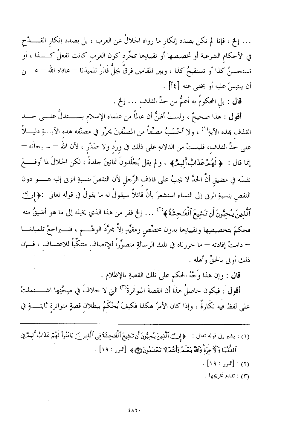 أقول: هذا صحيح، ولست أظن أن عالما من علماء الإسلام يستدل على حد القذف بهذه الآية (¬1) ولا أحسب مصنفا من المصنفين يحرر في مصنفه هذه الآية دليلا على حد القذف، فليست من الدلالة على ذلك في ورد ولا صدر، لأن الله - سبحانه - إنما قال: {لَهُمْ عَذَابٌ أَلِيمٌ}، ولم يقل يجلدون ثمانين جلدة، لكن الجلال لما أوقع نفسه في مضيق أن الحد لا يجب على قاذف الرجل لأن النقص بنسبة الزنى إليه هو دون النقص بنسبة الزنى إلى النساء استشعر بأن قائلا سيقول له ما يقول في قوله تعالى: {إِنَّ الَّذِينَ يُحِبُّونَ أَنْ تَشِيعَ الْفَاحِشَةُ} (¬2) ... إلخ ففر من هذا الذي يخيله إلى ما هو أضيق منه فحكم بتخصيصها وتقييدها بدون مخصص ومقيد إلا مجرد الوهم، فليراجع تلميذنا - دامت إفادته - ما حررناه في تلك الرسالة متصورا للإنصاف متنكبا للاعتساف، فإن ذلك أولى بالحق وأهله.