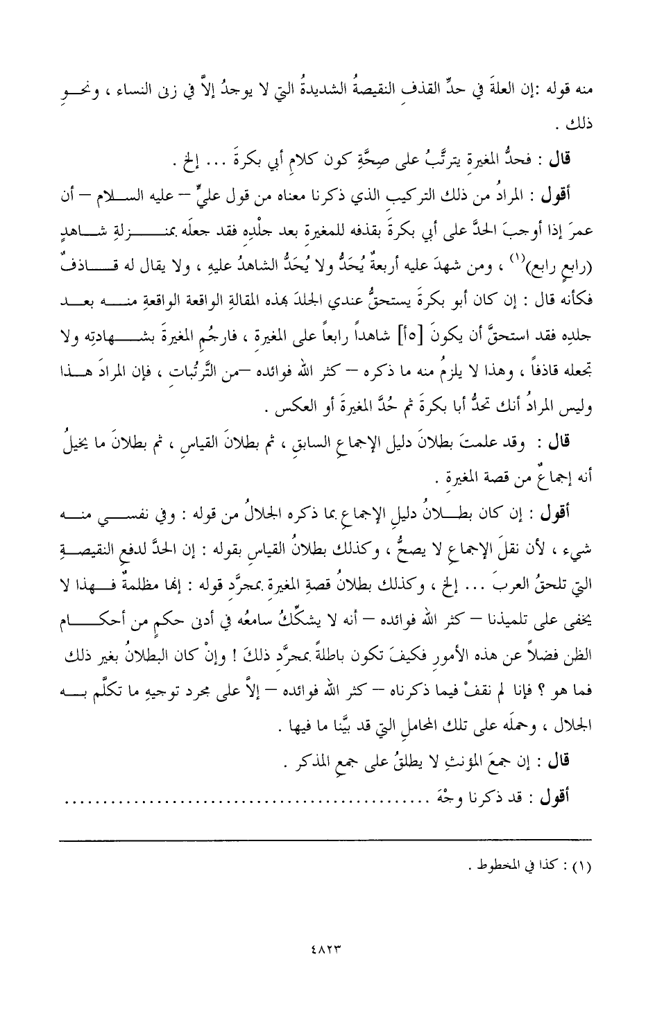 أقول: إن كان بطلان دليل الإجماع بما ذكره الجلال من قوله: وفي نفسي منه شيء؛ لأن نقل الإجماع لا يصح، وكذلك بطلان القياس بقوله: إن الحد لدفع النقيصة التي تلحق العرب ... إلخ، وكذلك بطلان قصة المغيرة بمجرد قوله: إنها مظلمة فهذا لا يخفى على تلميذنا - كثر الله فوائده - أنه لا يشكك سامعه في أدنى حكم من أحكام الظن فضلا عن هذه الأمور فكيف تكون باطلة بمجرد ذلك! وإن كان البطلان بغير ذلك فما هو؟ فإنا لم نقف فيما ذكرناه - كثر الله فوائده - إلا على مجرد توجيه ما تكلم به الجلال، وحمله على تلك المحامل التي قد بينا ما فيها.