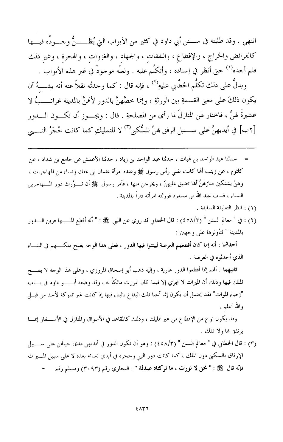 ثانيهما: أنهم إنما أقطعوا الدور عارية، وإليه ذهب أبو إسحاق المروزي، وعلى هذا الوجه لا يصح الملك فيها وذلك أن الميراث لا يجري إلا فيما كان المورث مالكا له، وقد وضعه أبو داود في باب " إحياء الموات " فقد يحتمل أن يكون إنما أحيا تلك البقاع بالبناء فيها إذ كانت غير مملوكة لأحد من قبل والله أعلم.