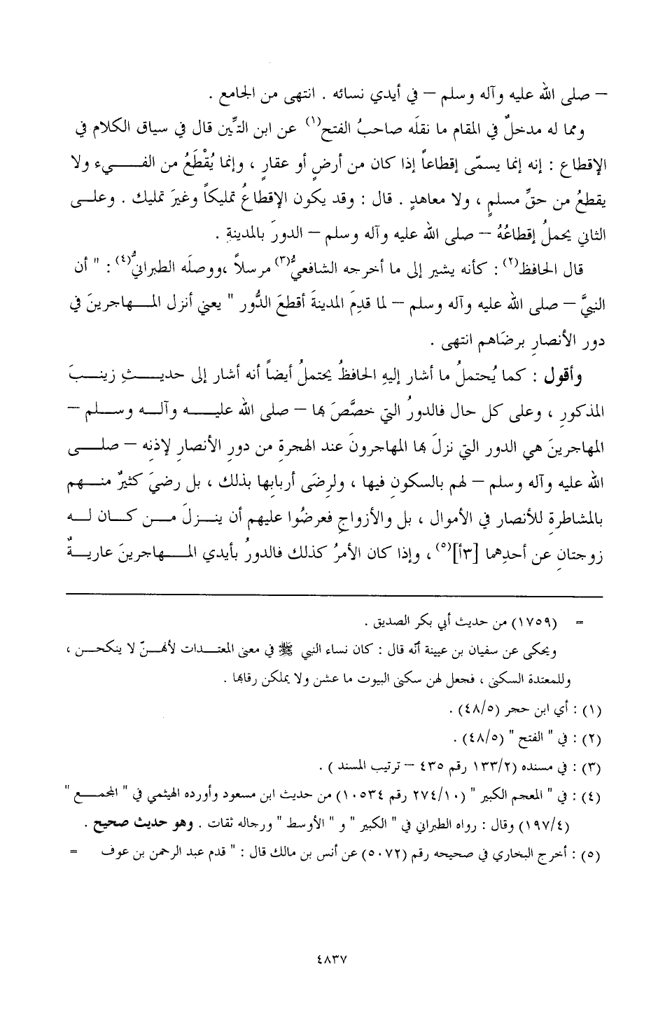 وأقول: كما يحتمل ما أشار إليه الحافظ يحتمل أيضًا أنه أشار إلى حديث زينب المذكور، وعلى كل حال فالدور التي خصص بها - صَلَّى اللهُ عَلَيْهِ وَآلِهِ وَسَلَّمَ - المهاجرين هي الدور التي نزل بها المهاجرون عند الهجرة من دور الأنصار لإذنه - صَلَّى اللهُ عَلَيْهِ وَآلِهِ وَسَلَّمَ - لهم بالسكون فيها، ولرضى أربابها بذلك، بل رضي كثير منهم بالمشاطرة للأنصار في الأموال، بل والأزواج فعرضوا عليهم أن ينزل من كان له زوجتان عن أحدهما [3أ] (¬5)، وإذا كان الأمر كذلك فالدور بأيدي المهاجرين عارية