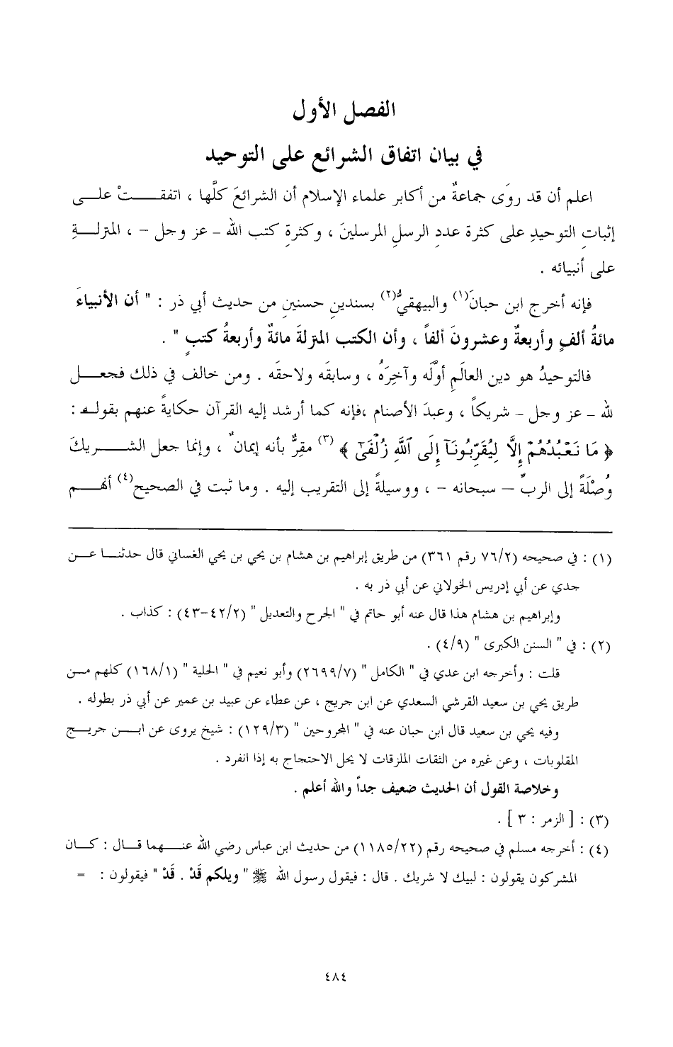 اعلم أن قد روى جماعة من أكابر علماء الإسلام أن الشرائع كلها اتفقت على إثبات التوحيد على كثرة عدد الرسل المرسلين، وكثرة كتب الله -عز وجل-، المنزلة على أنبيائه.
