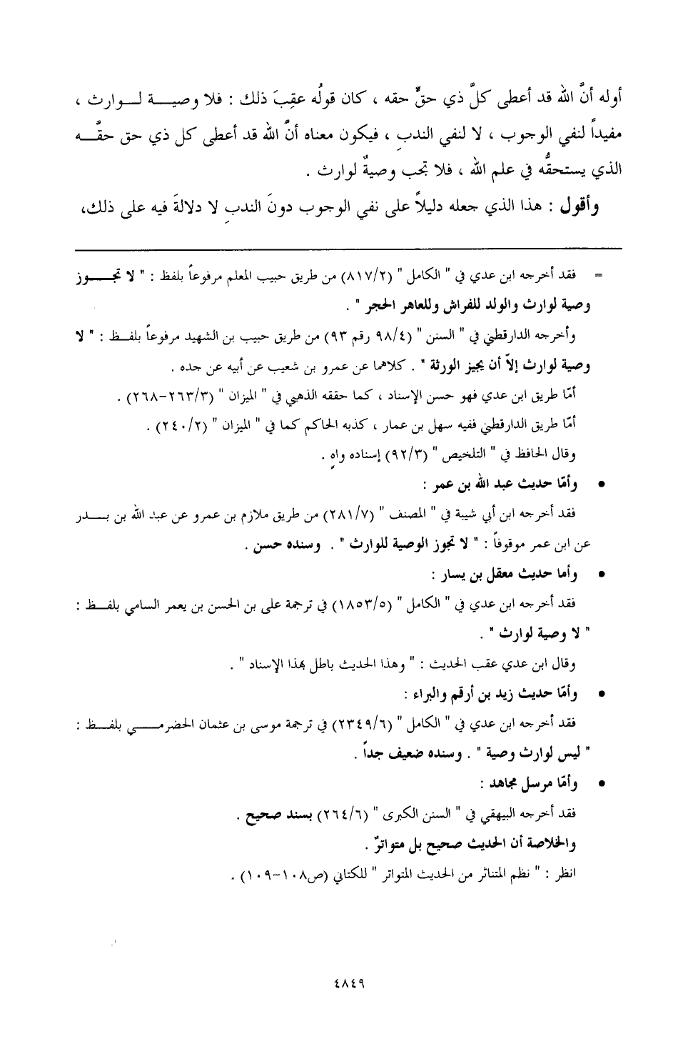 أوله أن الله قد أعطى كل ذي حق حقه، كان قوله عقب ذلك: فلا وصية لوارث، مفيدا لنفي الوجوب، لا لنفي الندب، فيكون معناه أن الله قد أعطى كل ذي حق حقه الذي يستحقه في علم الله، فلا تجب وصية لوارث.