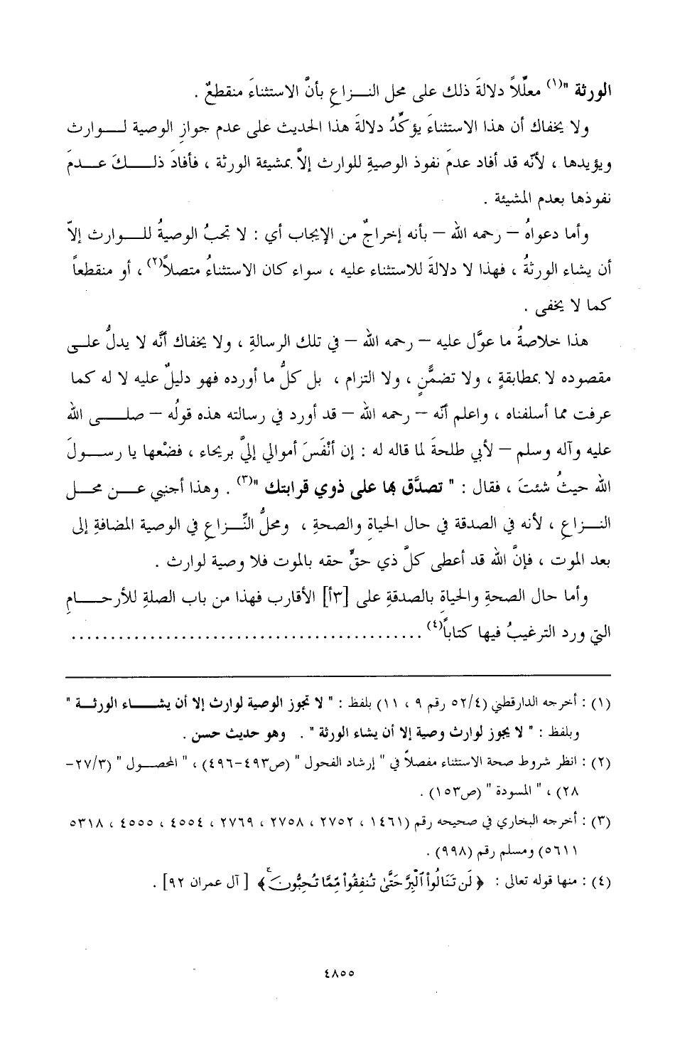 هذا خلاصة ما عول عليه - رحمه الله - في تلك الرسالة، ولا يخفاك أنه لا يدل على مقصوده لا بمطابقة، ولا تضمن، ولا التزام، بل كان كل ما أورده فهو دليل عليه لا له كما عرفت مما أسلفنا، واعلم أنه - رحمه الله - قد أورد في رسالته هذه قوله - صَلَّى اللهُ عَلَيْهِ وَآلِهِ وَسَلَّمَ - لأبي طلحة لما قاله له: إن أنفس أموالي إلي بريحاء، فضعها يا رسول الله حيث شئت، فقال: " تصدق بها على ذوي قرابتك " (¬3) وهذا أجنبي عن محل النزاع، لأنه في الصدقة في حال الحياة والصحة، ومحل النزاع في الوصية المضافة إلى بعد الموت، فإن الله قد أعطى كل ذي حق حقه بالموت فلا وصية لوارث.