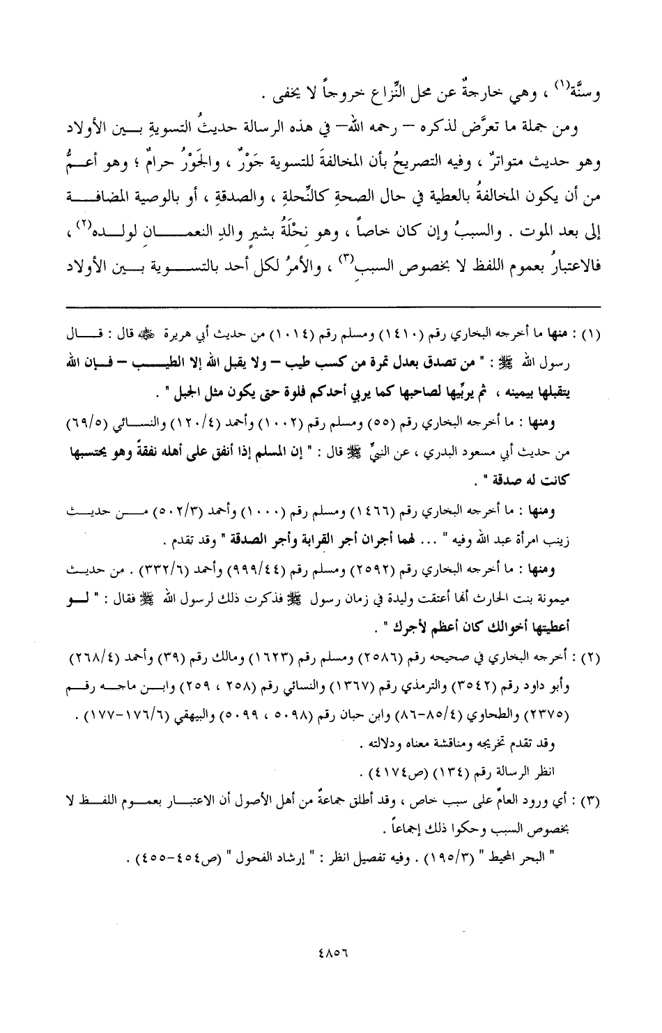 ومن جملة ما تعرض لذكره - رحمه الله - في هذه الرسالة حديث التسوية بين الأولاد وهو حديث متواتر، وفيه التصريح بأن المخالفة للتسوية جور، والجور حرام، وهو أعم من أن يكون المخالفة بالعطية في حال الصحة كالنحلة، والصدقة، أو بالوصية المضافة إلى بعد الموت، والسبب وإن كان خاصا، وهو نحلة يشير والد النعمان لولده (¬2)، فالاعتبار بعموم اللفظ لا بخصوص السبب (¬3)، والأمر لكل أحد بالتسوية بين الأولاد