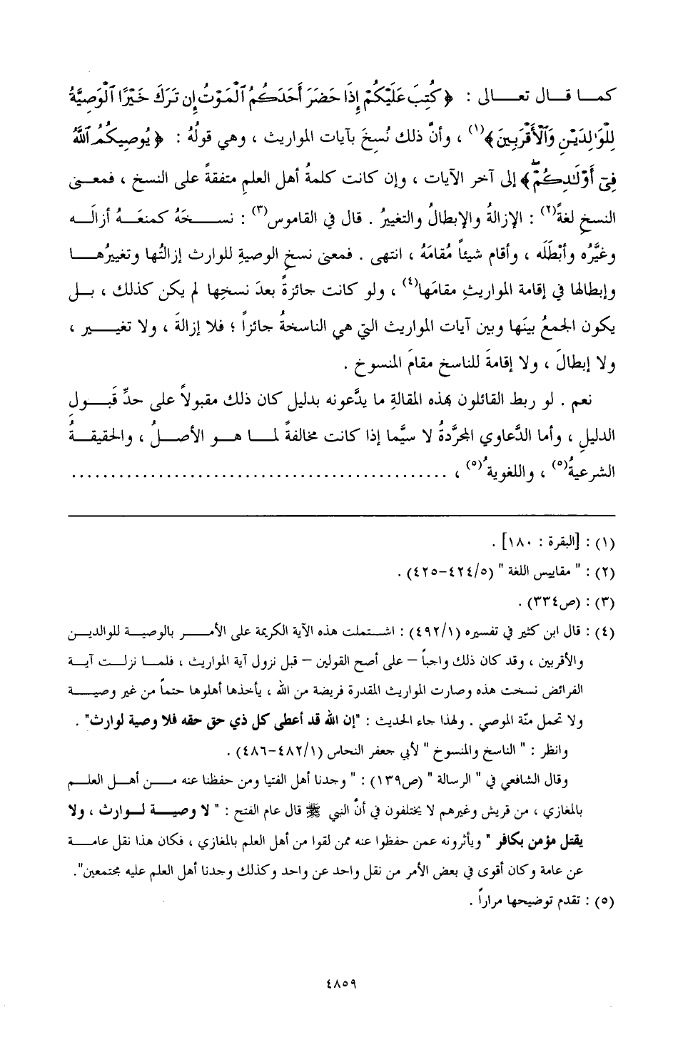 (¬4) قال ابن كثير في تفسيره (1/ 492): اشتملت هذه الآية الكريمة على الأمر بالوصية للوالدين والأقربين، وقد كان ذلك واجبًا- على أصح القولين- قبل نزول آية المواريث، فلما نزلت آية الفرائض نسخت هذه وصارت المواريث المقدرة فريضة من الله، يأخذها أهلوها حتمًا من غير وصية ولا تحمل منة الموصي. ولهذا جاء الحديث: "إن الله قد أعطى كل ذي حق حقه فلا وصية لوارث".