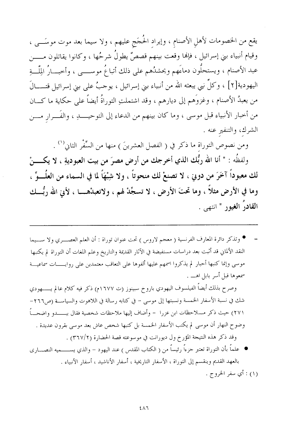يقع من الخصومات لأهل الأصنام، وإيراد الحجج عليهم، ولا سيما بعد موت موسى، وقيام أنبياء بني إسرائيل، فإنها وقعت بينهم قصص يطول شرحها، وكانوا يقاتلون من عبد الأصنام، ويستحلون دماءهم ويحشدهم على ذلك اتباع موسى، وأخبار الملة اليهودية [2]، وكل نبي يبعثه الله من أنبياء بني إسرائيل، يوجب على بني إسرائيل قتال من يعبد الأصنام، وغزوهم إلى ديارهم، وقد اشتملت التوراة أيضًا على حكاية ما كان من أخبار الأنبياء قبل موسى، وما كان بينهم من الدعاء إلى التوحيد، والفرار من الشرك، والتنفير عنه.