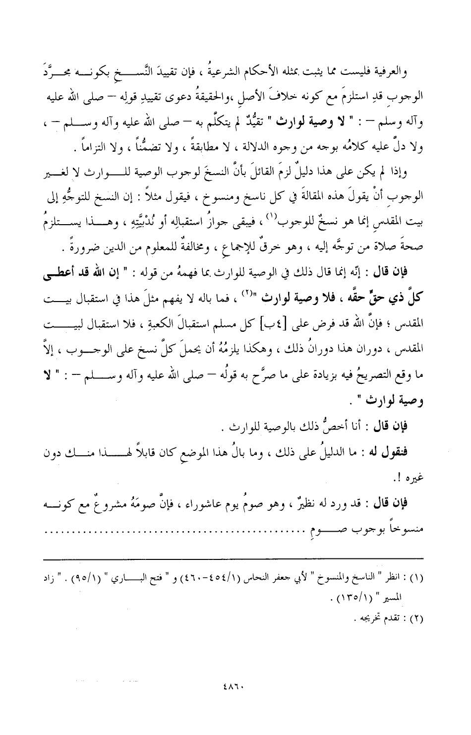 فإن قال: إنه قال ذلك في الوصية للوارث لما فهمه من قوله: " إن الله قد أعطى كل ذي حق حقه، فلا وصية لوارث " (¬2) فما باله لا يفهم مثل هذا في استقبال بيت المقدس، فإن الله قد فرض على [4ب] كل مسلم استقبال الكعبة، فلا استقبال لبيت المقدس، دوران هذا دوران ذلك، وهكذا يلزمه أن يحمل كل نسخ على الوجوب، إلا ما وقع التصريح فيه بزيادة على ما صرح به قوله - صَلَّى اللهُ عَلَيْهِ وَآلِهِ وَسَلَّمَ -: " لا وصية لوارث ".