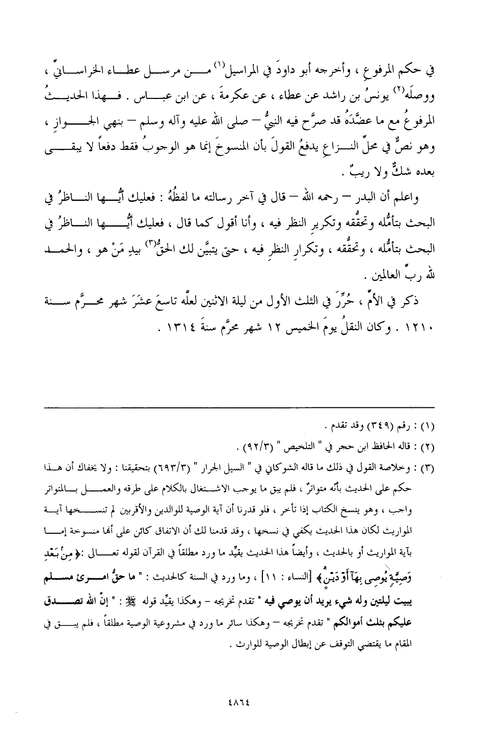 (¬3) وخلاصة القول في ذلك ما قاله الشوكاني في "السيل الجرار" (3/ 693) بتحقيقنا: ولا يخفاك أن هذا حكم على الحديث بأنه متواتر، فلم يبق ما يوجب الاشتغال بالكلام على طرقه والعمل بالمتواتر واجب، وهو بنسخ الكتاب إذا تأخر، فلو قدرنا أن آية الوصية للوالدين والأقربين لم تنسخها آية المواريث لكان هذا الحديث يكفي في نسخها، وقد قدمنا لك أن الاتفاق كائن على أنها منسوخة إما بآية المواريث أو بالحديث، وأيضًا هذا الحديث يقيد ما ورد مطلقًا في القرآن لقوله تعالى:} من بعد وصية يوصى بها أو دين {[النساء: 11]، وما ورد في السنة كالحديث: "ما حق امرئ مسلم يبيت ليلتين وله شيء يريد أن يوصي فيه" تقدم تخريجه- وهكذا يقيد قوله صَلَّى اللهُ عَلَيْهِ وَسَلَّمَ: " إن الله تصدق عليكم بثلث أموالكم" تقدم تخريجه- وهكذا سائر ما ورد في مشروعية الوصية مطلقًا، فلم يبق في المقام ما يقتضي عن إبطال الوصية للوارث.