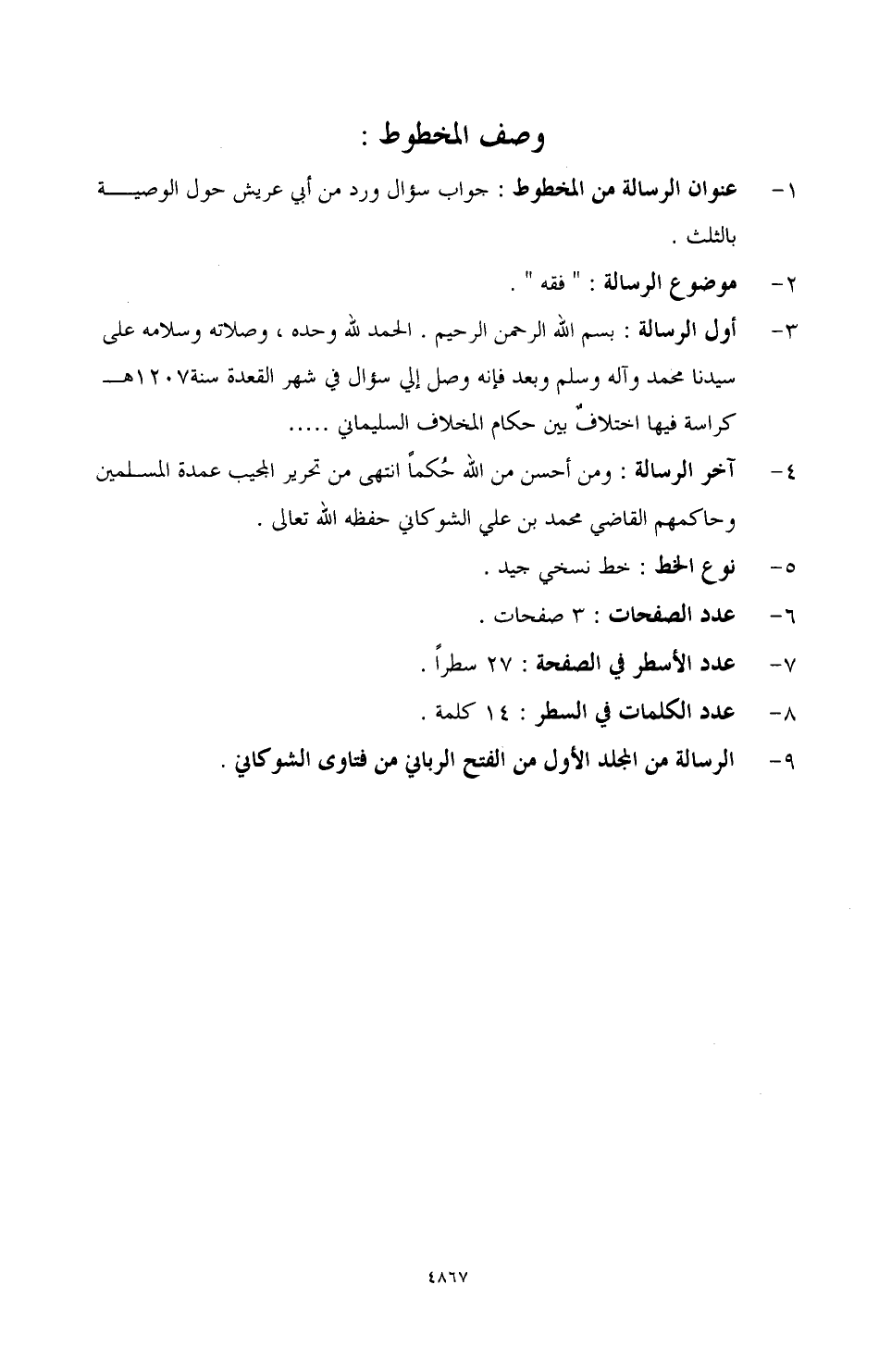 9 - الرسالة من المجلد الأول من الفتح الرباني من فتاوى الشوكاني.