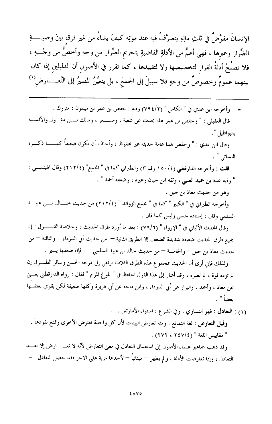 الإنسان مفوض في ثلث ماله يتصرف فيه عند موته كيف يشاء من غير فرق بين وصية الضرار وغيرها، فهي أعم من الأدلة القاضية بتحريم الضرار من وجه وأخص من وجه، فلا تصلح أدلة الفرار لتخصيصها ولا لتقييدها، كما تقرر في الأصول أن الدليلين إذا كان بينهما عموم وخصوص من وجه فلا سبيل إلى الجمع، بل يتعين المصير إلى التعارض (¬1)