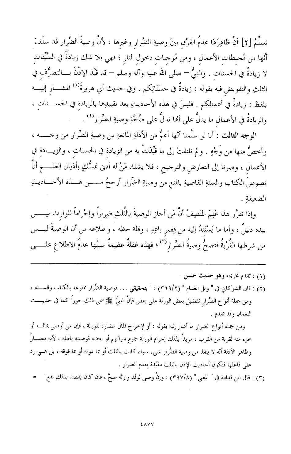 (¬2) قال الشوكاني في "وبل الغمام" (2/ 396): "بتحقيقي .. فوصية الضرار ممنوعة بالكتاب والسنة، ومن جملة أنواع لضرار تفضيل بعض الورثة على بعض فإن النبي -صَلَّى اللهُ عَلَيْهِ وَسَلَّمَ- سمى ذلك جورًا كما في حديث النعمان وقد تقدم".