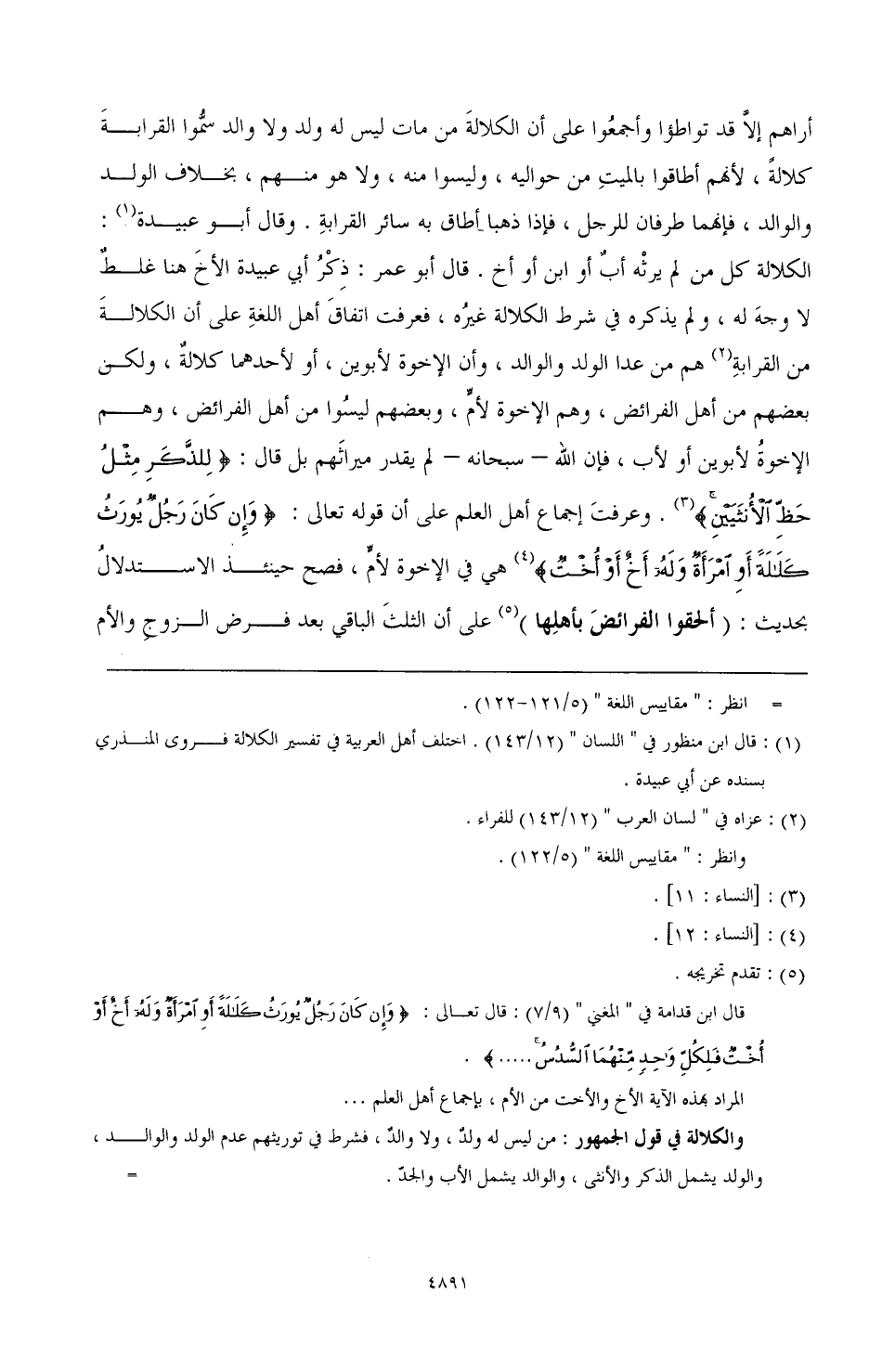 (¬1) قال ابن منظور في "اللسان" (12/ 143). اختلف أهل العربية في تفسير الكلالة فروى المنذري بسنده عن أبي عبيدة.