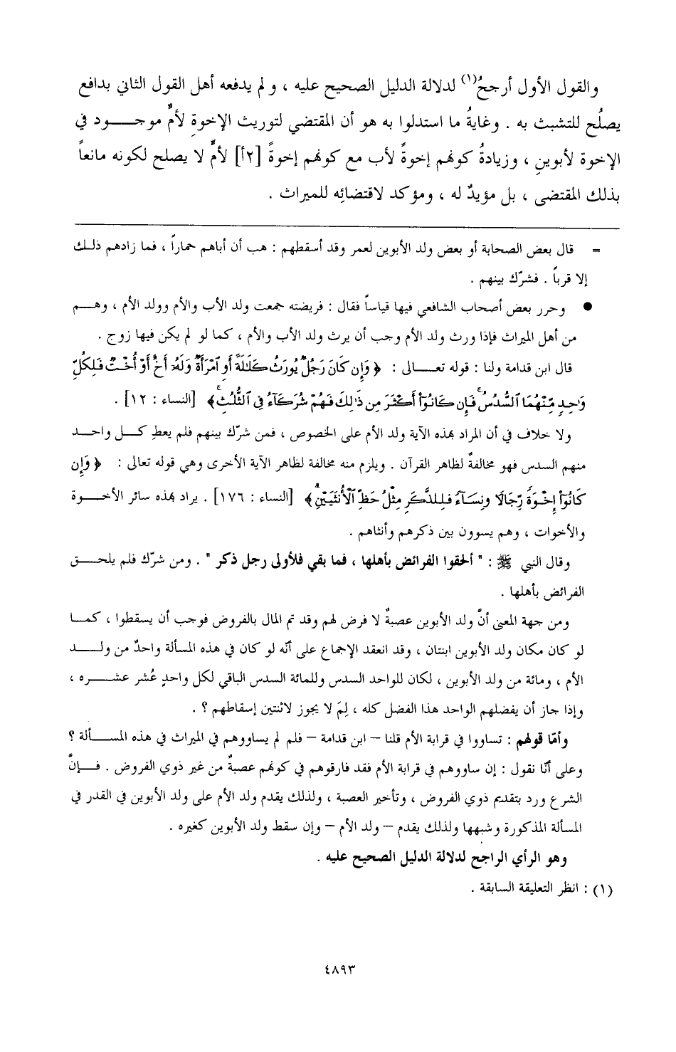 والقول الأول أرجح (¬1) لدلالة الدليل الصحيح عليه، ولم يدفعه أهل القول الثاني بدافع يصلح للتشبث به، وغاية ما استدلوا به هو أن المقتضي لتوريث الإخوة لأم موجود في الإخوة لأبوين، وزيادة كونهم إخوة لأب مع كونهم إخوة [2أ] لأم لا يصلح لكونه مانعا بذلك المقتضى، بل مؤيد له، ومؤكد لاقتضائه للميراث.
