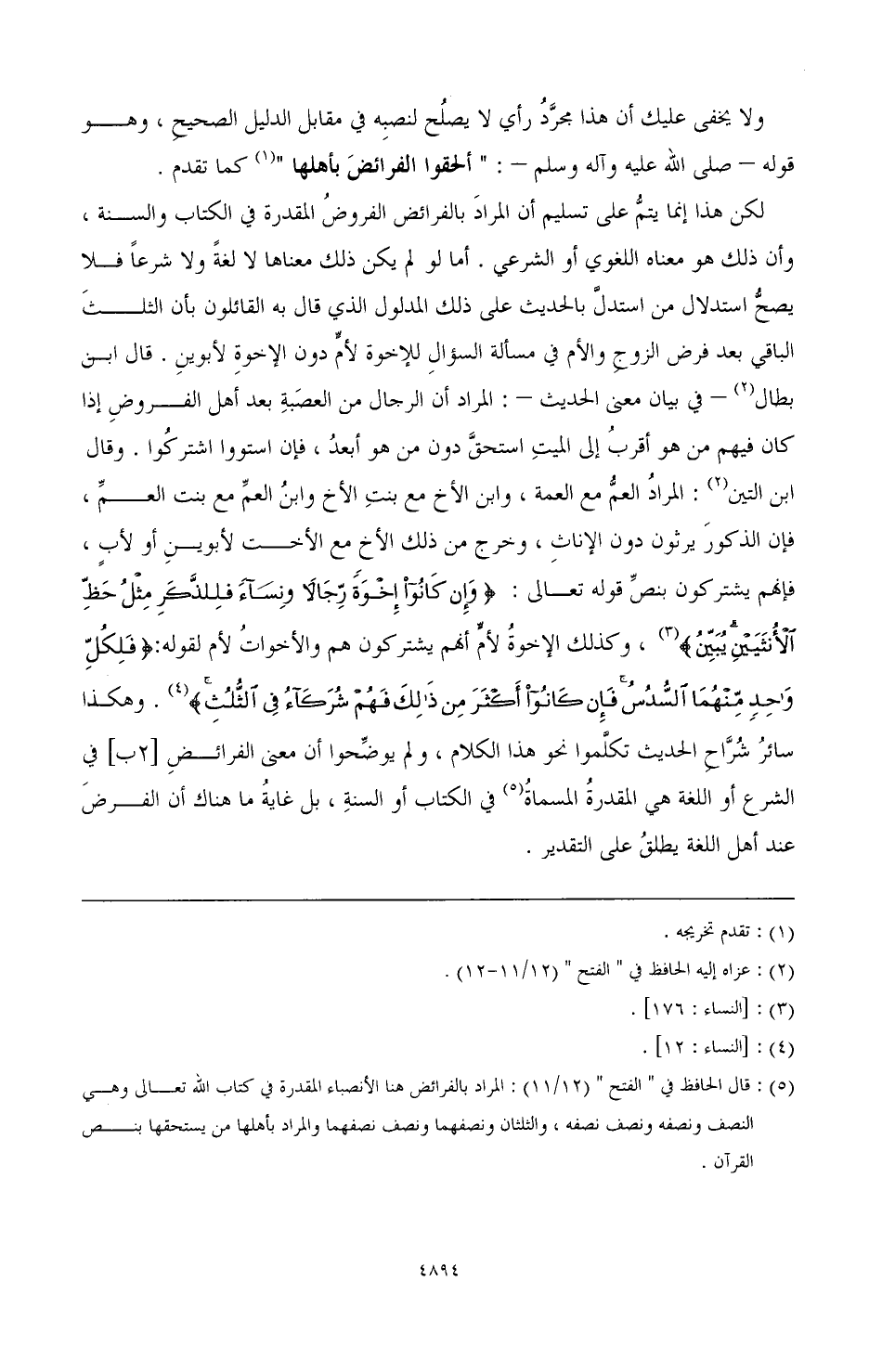 لكن هذا إنما يتم على تسليم أن المراد بالفرائض الفروض المقدرة في الكتاب والسنة، وأن ذلك هو معناه اللغوي أو الشرعي، أما لو لم يكن ذلك معناها لا لغة ولا شرعا فلا يصح استدلال من استدل بالحديث على ذلك المدلول الذي قال به القائلون بأن الثلث الباقي بعد فرض الزوج والأم في مسألة السؤال لإخوة لأم دون الإخوة لأبوين، قال ابن بطال (¬2) - في بيان معنى الحديث -: المراد أن الرجال من العصبة بعد أهل الفروض إذا كان فيهم من هو أقرب إلى الميت استحق دون من هو أبعد، فإن استووا اشتركوا، وقال ابن التين (¬3): المراد العم مع العمة، وابن الأخ مع بنت الأخ وابن العم مع بنت العم، فإن المذكور يرثون دون الإناث، وخرج من ذلك الأخ مع الأخت لأبوين أو لأب، فإنهم يشتركون بنص قوله تعالى:} وَإِنْ كَانُوا إِخْوَةً رِجَالًا وَنِسَاءً فَلِلذَّكَرِ مِثْلُ حَظِّ الْأُنْثَيَيْنِ يُبَيِّنُ {(¬4)، وكذلك الإخوة لأم أنهم يشتركون هم والأخوات لأم لقوله:} فَلِكُلِّ وَاحِدٍ مِنْهُمَا السُّدُسُ فَإِنْ كَانُوا أَكْثَرَ مِنْ ذَلِكَ فَهُمْ شُرَكَاءُ فِي الثُّلُثِ {(¬5). وهكذا سائر شراح الحديث تكلموا نحو هذا الكلام، ولم يوضحوا أن معنى الفرائض [2ب] في الشرع أو اللغة هو القدرة المسماة (¬6) في الكتاب والسنة، بل غاية ما هناك أن الفرض عند أهل اللغة يطلق على التقدير.