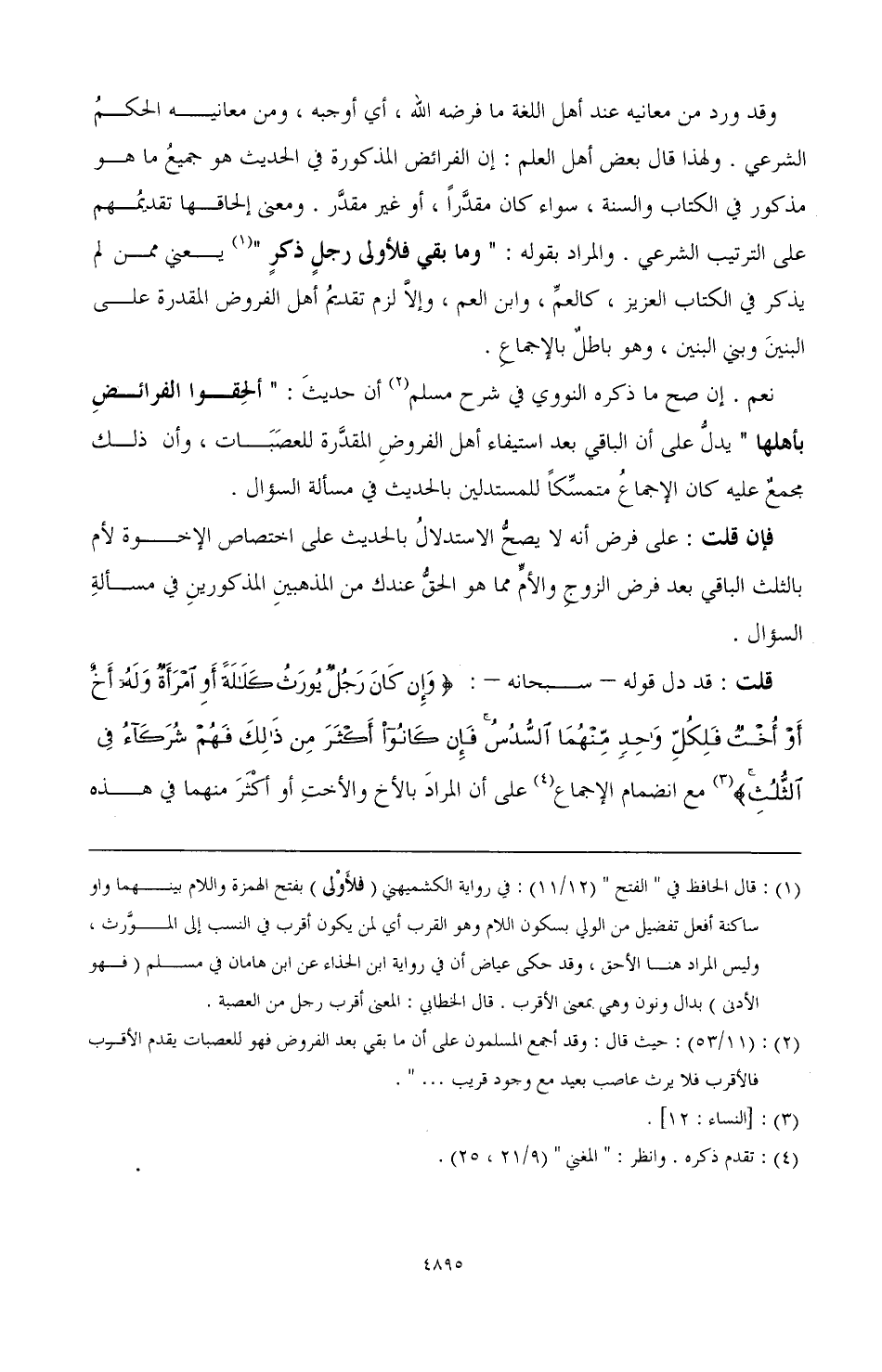 وقد ورد من معانيه عند أهل اللغة ما فرضه الله، أي أوجبه، ومن معانيه الحكم الشرعي، ولهذا قال بعض أهل العلم: إن الفرائض المذكورة في الحديث هو جميع ما هو مذكور في الكتاب والسنة، سواء كان مقدرا، أو غير مقدر، ومعنى إلحاقها تقديمهم على الترتيب الشرعي، والمراد بقوله: " وما بقي فلأولى رجل ذكر " (¬1) يعني ممن لم يذكر في الكتاب العزيز، كالعم، وابن العم، وإلا لزم تقديم أهل الفروض المقدرة على البنين وبني البنين، وهو باطل بالإجماع.