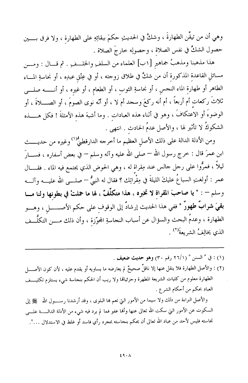 ومن الأدلة الدالة على ذلك الأصلِ العظيم ما أخرجه الدارقطنيُّ (¬1) وغيره من حديث ابن عمرَ قال: خرج رسول الله -صَلَّى اللهُ عَلَيْهِ وَسَلَّمَ- في بعض أسفاره فسارَ ليلًا، فمرُّوا على رجل جالس عند مِقراةٍ له وهي الحوض الذي يجتمع فيه الماء. فقال عمر: أولغتِ السباعُ عليكَ الليلةَ في مِقْراتِك؟ فقال له النبيُّ صَلَّى اللهُ عَلَيْهِ وَسَلَّمَ: " يا صاحب المقراةِ لا تخبره، هذا متكلِّفٌن لها ما حملتْ في بطونِها ولنا ما بقيَ شرابٌ طهورٌ" ففي هذا الحديث إرشاد إلى الوقوفِ على حكم الأصلِ، وهو الطهارة وعدمُ البحث والسؤال عن أسباب النجاسةِ المجوِّزِة، وأن ذلك من التكلُّف الذي يخالفُ الشريعةَ (¬2).