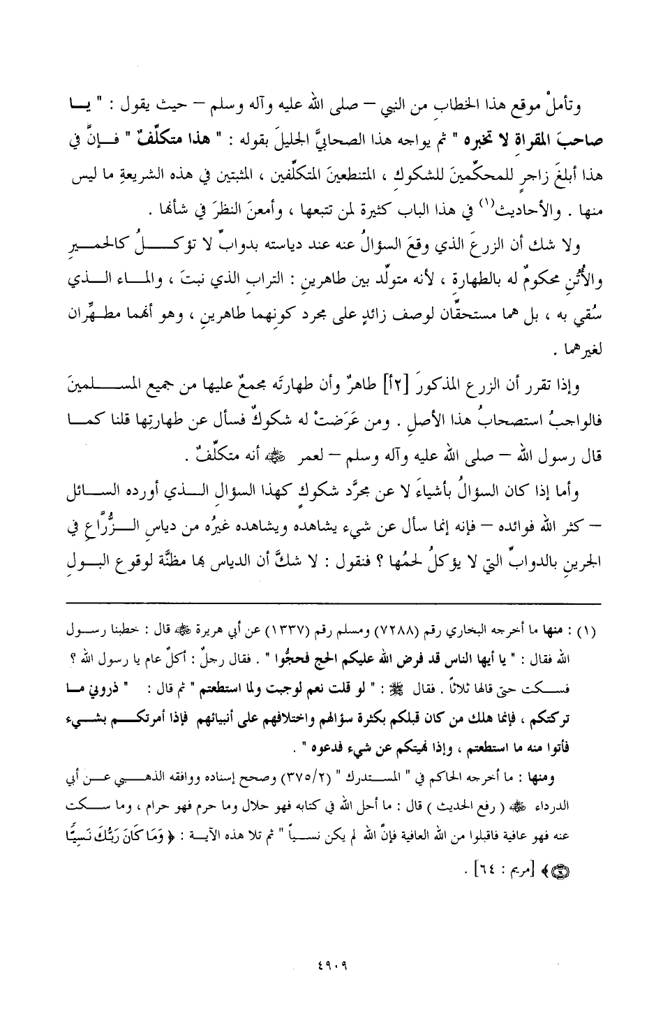 وإذا تقرر أن الزرع المذكورَ [2أ] طاهرٌ وأن طهارتَه مجمعٌ عليها من جميع المسلمينَ فالواجبُ استصحابُ هذا الأصل. ومن عَرَضتْ له شكوكٌ فسأل عن طهارتِها قلنا كما قال رسول الله -صَلَّى اللهُ عَلَيْهِ وَسَلَّمَ- لعمر رضي الله عنه أنه متكلِّفٌ.