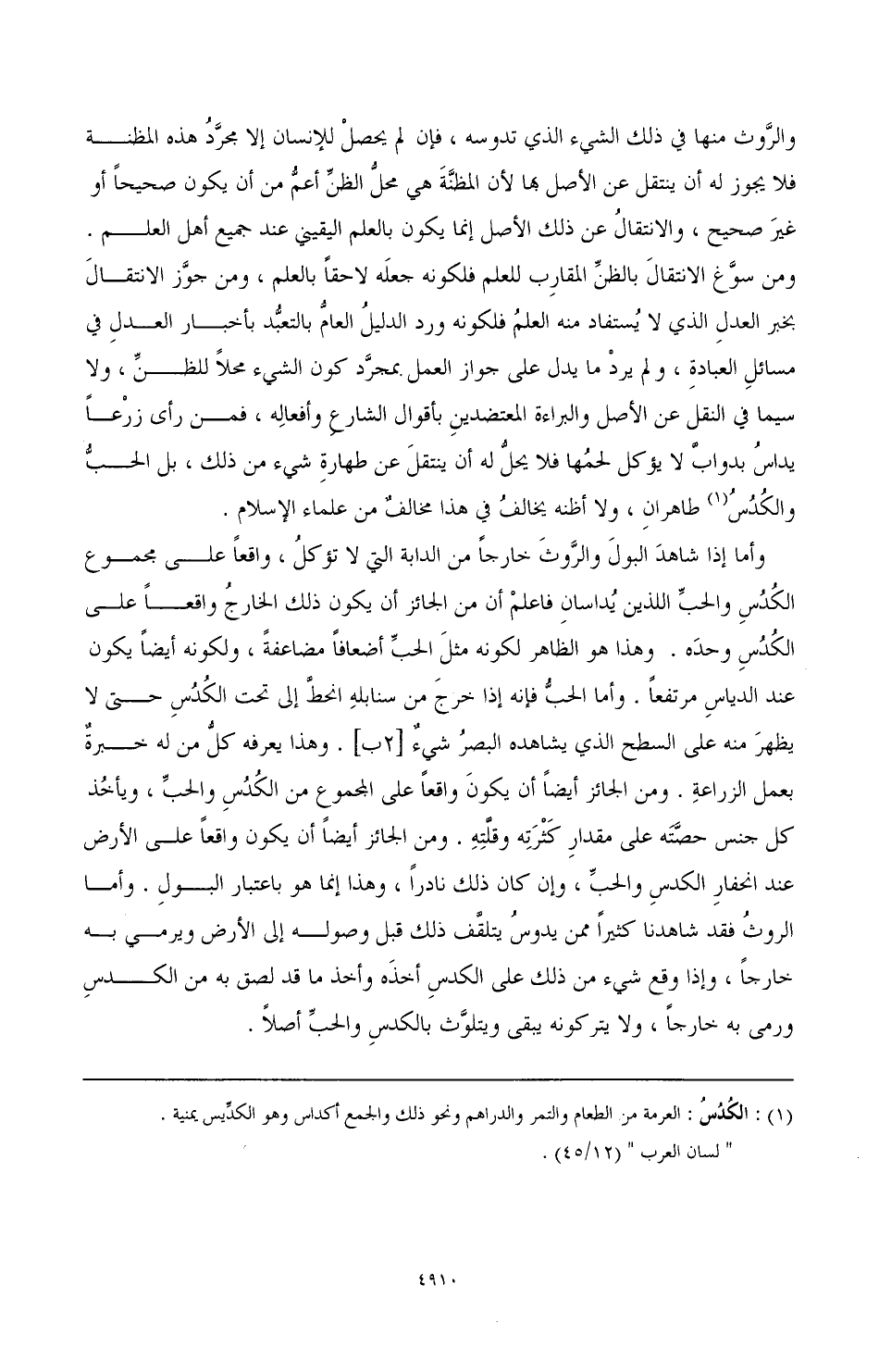 والرَّوث منها في ذلك الشيء الذي تدوسه، فإن لم يحصلْ للإنسان إلا مجرَّدُ هذه المظنة فلا يجوز له أن ينتقل عن الأصل بها لأن المظنَّةَ هي محلُّ الظنِّ أعمُّ من أن يكون صحيحًا أو غيرَ صحيح، والانتقالُ عن ذلك الأصل إنما يكون بالعلم اليقيني عند جميع أهل العلم. ومن سوَّغ الانتقال بالظنِّ المقارِب للعلم فلكونه جعلَه لاحقًا بالعلم، ومن جوَّز الانتقالَ بخبر العدلِ الذي لا يُستفاد منه العلمُ فلكونه ورد الدليلُ العامُّ بالتعبُّد بأخبار العدلِ في مسائلِ العبادةِ ولم يردْ ما يدل على جواز العلم بمجرَّد كون الشيء محلًّا للظنِّ ولا سيما في النقل عن الأصل والبراءة المعتضدينِ بأقوال الشارعِ وأفعالِه، فمن رأى زرْعًا يداسُ بدوابِّ لا يؤكل لحمُها فلا يحلُّ له أن ينتقلَ عن طهارةِ شيء من ذلك، بل الحبُّ والكُدُسُ (¬1) طاهرانِ ولا أظنه يخالفُ في هذا مخالفٌ من علماء الإسلام.