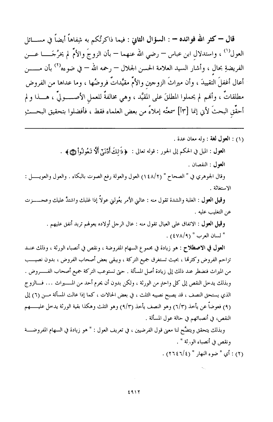 قال- كثر الله فوائده-: السؤال الثاني: فيما ذاكرتُكم به شِفاهًا أيضًا في مسائل العول (¬1)، واستدلال ابن عباس- رضي الله عنهما- بأن الزوجَ والأمّ لم يخرُجَا عن الفريضةِ بحالٍ، وأشار العلامة الحسن الجلال- رحمه الله- في ضوءه (¬2) بأن من أعال أغفلَ التقييدَ، وأن ميراثَ الزوجينِ والأمِّ مقيِّداتٌ فروضُها وما عداها من الفروض مطلقاتٌ وأنه لم يحملوا المطلقَ على المقيَّد، وهي مخالفةٌ للعملِ الأصوليِّ، هذا ولم أحقِّقِ البحثَ لأني إنما [3أ] سمعتُه إملاءً من بعض العلماء فقط، فأفضلوا بتحقيق البحثِ