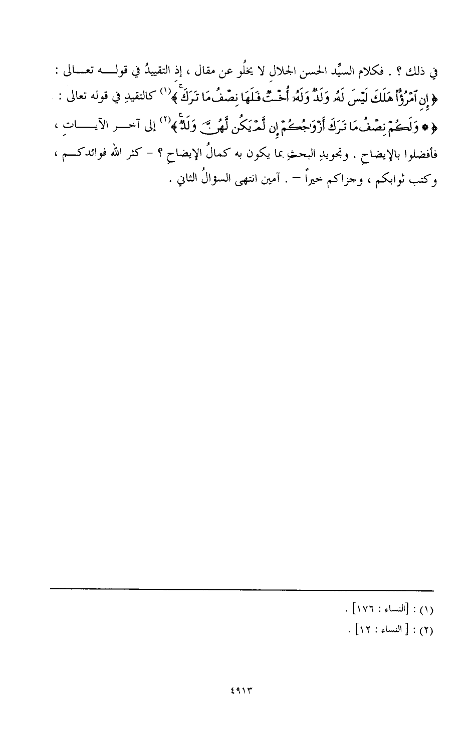 في ذلك؟ فكلام السيِّد الحسن الجلالِ لا يخلُو عن مقال، إذِ التقييدُ في قوله تعالى:} إن امرؤا هلك ليس له ولد وله أخت فلها نصف ما ترك {(¬1) كالتقييدِ في قوله تعالى:} ولكم نصف ما ترك أزواجكم إن لم يكن لهن ولد (¬2) إلى آخر الآياتِ، فأفضلوا بالإيضاحِ. وتجويدِ البحثِ بما يكون به كمالُ الإيضاحِ؟ كثر الله فوائدكم، وكتب ثوابكم، وجزاكم الله خيرًا- آمين انتهى السؤالُ الثاني.