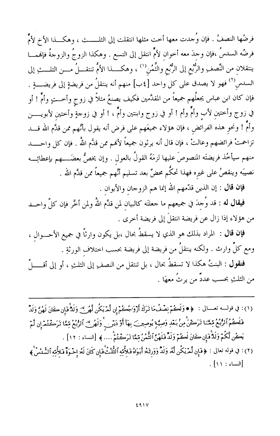 فرضُها النصفُ. فإن وُجدت معها أخت مثلها انتقلت إلى الثلث، وهكذا الأخ لأمٍّ فرضُه السدسُ، فإن وجدَ معه أخوانِ لأمٍّ انتقل إلى التسع. وهكذا الزوجُ والزوجةُ فإنهما ينتقلانِ من النِّصفِ والرُّبُعِ إلى الرُّبعِ والثُّمُنِ (¬1)، وهكذا الأمُّ تنتقلُ من الثلثِ إلى السدسِ (¬2) فهول لا يصدق على كل واحد [4ب] منهم أنه ينتقلُ من فريضةٍ إلى فريضةٍ. فإن كان ابن عباس يجعلُهم جميعًا من المقدَّمين فكيف يصنعُ مثلًا في زوجٍ وأختٍ وأمٍّ! أو في زوج وأختينِ لأبٍ وأمٍّ وأم! أو في زوج وابنتين وأمٍّ،! أو في زوجةٍ وأختينٍ لأبوين وأمٍّ! ونحوِ هذه الفرائضِ، فإن هؤلاء جميعَهم على فرض أنه يقول بأنَّهم ممن قدَّم الله قد تزاحمتْ فرائضهم وعالتْ، فإن قال أنه يرثون جميعًا لأنهم ممن قدَّم اللهُ. فإن كل واحد منهم سيأخُذ فريضتَه المنصوصَ عليها لزمَهُ القولُ بالعولِ. وإن يخصُّ بعضَهم بإعطائِه نصيبَه وينقصُ على غيرِه فهذا تحكُّم محضٌ بعد تسليم أنَّهم جميعًا ممن قدم الله.